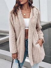 Highlights [Fabric] : This elegant women's casual jacket is crafted from high-quality polyester, providing warmth and a breathable feel suitable for fall and winter. The plush, soft fabric ensures comfort throughout the day, making it an essential addition to any wardrobe. [Fit] : Designed with a regular fit, this long-sleeve jacket offers a contemporary, stylish silhouette. Its relaxed fit allows for ease of movement and layering over casual or office outfits, offering both comfort and style. [Design Highlights] : Featuring a chic open-front style complemented by a classic lapel neckline, this jacket includes practical pockets to enhance its casual appeal. The solid apricot color is versatile enough to pair with a variety of outfits, while subtle vertical ribbing adds texture and sophistication. [Occasions] : Whether heading to the office, attending meetings, or enjoying a casual day out, this jacket suits a range of scenarios from daily wear to street style occasions, effortlessly blending functionality and elegance. [Size Range] : Available in a versatile size range from S to XL, this jacket caters to various body types, ensuring a flattering fit for everyone.