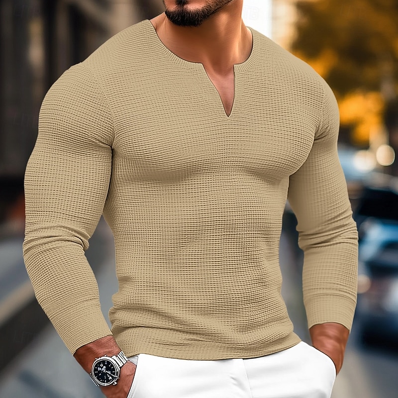 Highlights [Fabric:] Crafted from a waffle textured polyester blend, this men's long-sleeve shirt offers a unique look combined with comfort and breathability. The micro-elastic fabric ensures a slight stretch, providing ease of movement for a relaxed fit. [Fit:] Designed with a regular fit, this shirt highlights a slim-fit cut that accentuates the physique, offering a stylish and contemporary appearance suitable for various body types. [Design Highlights:] The shirt features a distinctive V-neck with a modern notch detail, enhancing its contemporary flair. The effortless style of this basic fashion piece makes it a must-have addition to any wardrobe. [Occasions:] Perfect for versatile styling, this shirt suits a range of occasions from casual daily outings to vacations and streetwear. Its adaptable design makes it an excellent choice for both relaxed and slightly formal events. [Size Range:] Available in a broad size range from S to XXXL, with colors including White, Black, Orange, Gray, and Khaki, ensuring options for every taste and preference.