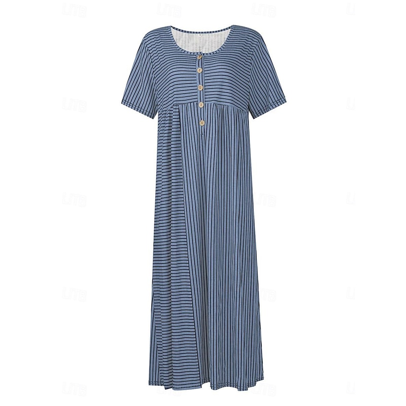 The dress features a classic crew neckline with button details down the front, adding a laid-back, stylish flair. Short sleeves provide modest coverage while maintaining a breezy feel. Practical side pockets enhance the dress's functionality, allowing for convenient storage without sacrificing style.
