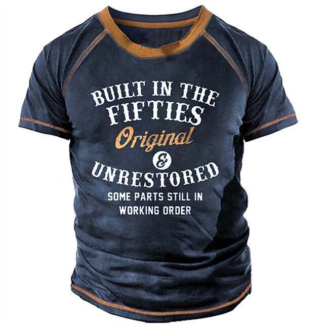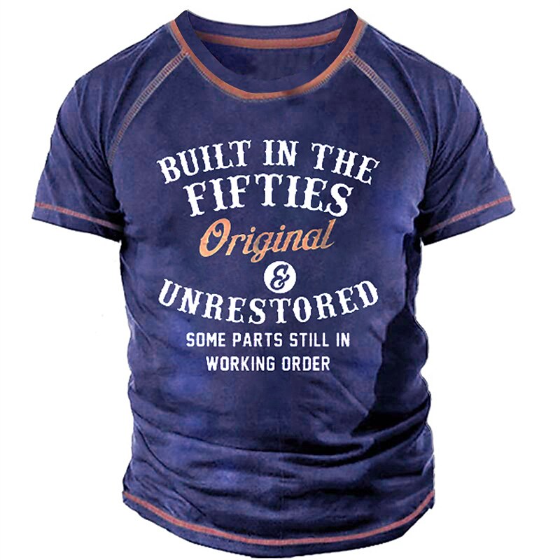 : The T-shirt features an eye-catching 3D print with a bold graphic and letter design, depicting the playful text "Built in the Fifties, Original & Unrestored, Some Parts Still in Working Order," which adds a vintage flair. The distressed appearance contributes to the retro aesthetic, while the double-stitching along the seams ensures durability.