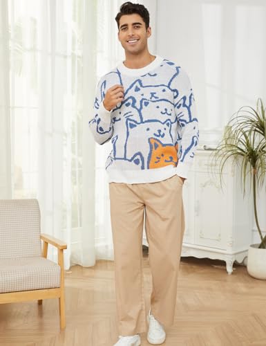 • Features: Loose fit mens fall sweaters, anime cats printed long sleeve knit jumper top, crewneck fashion streetwear, cute sweaters full of cartoon cats.