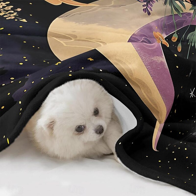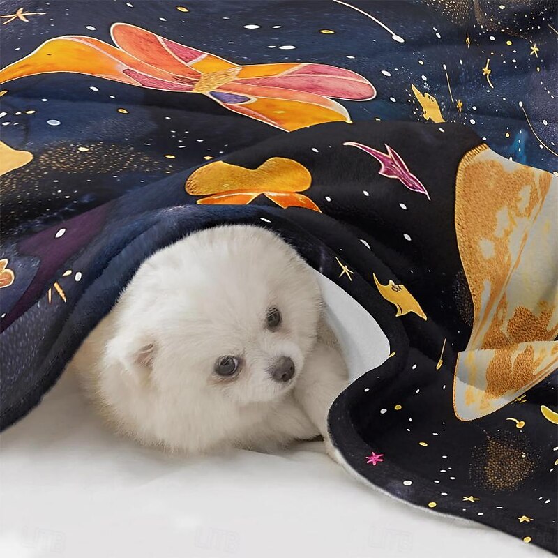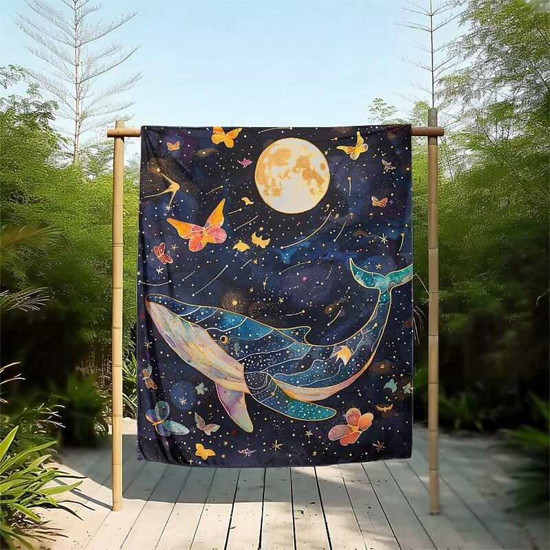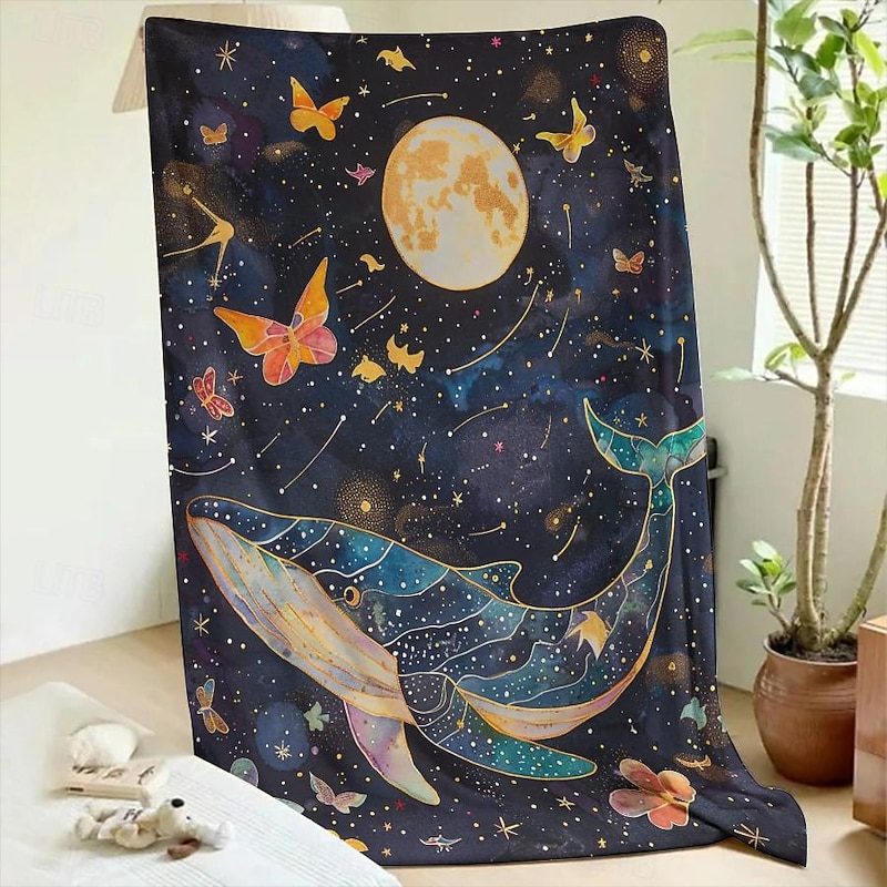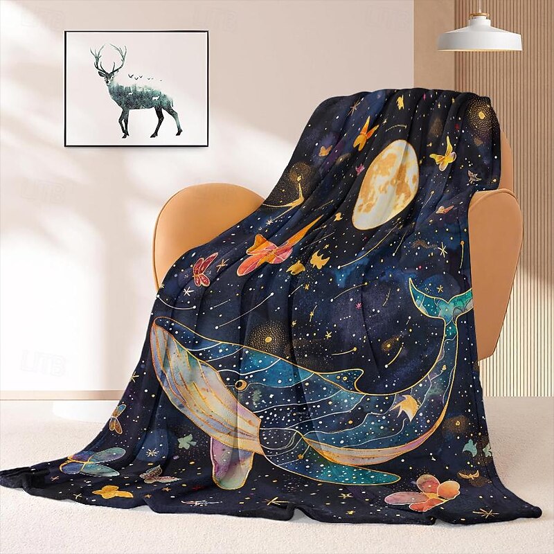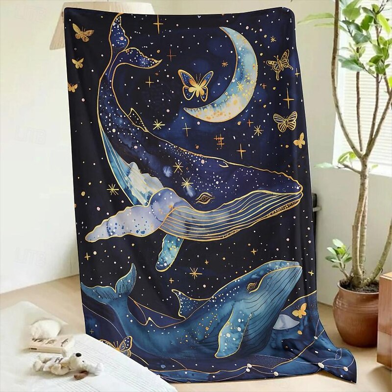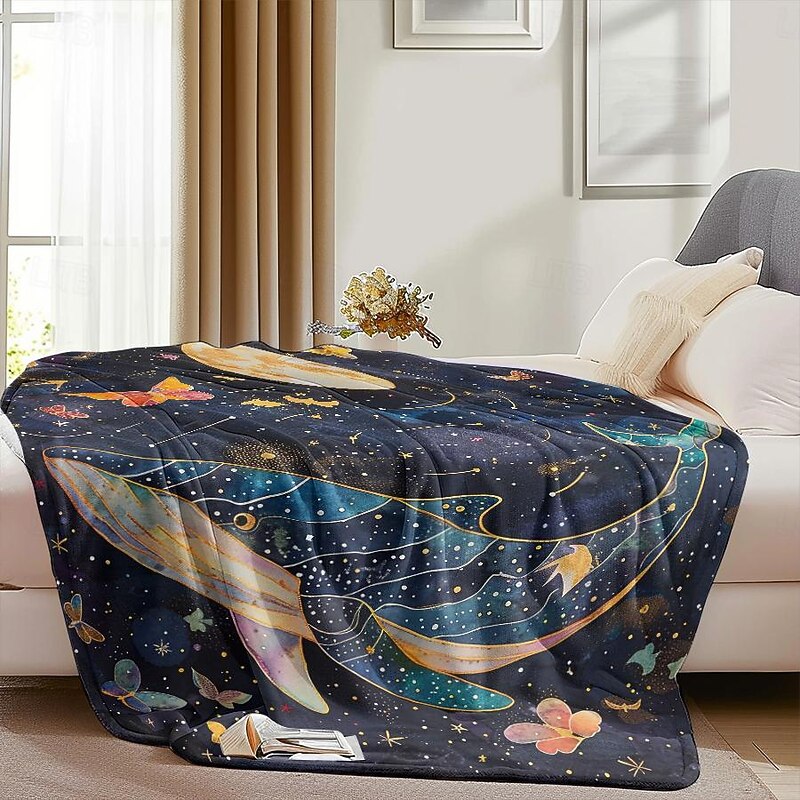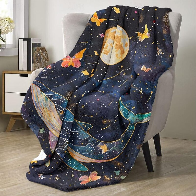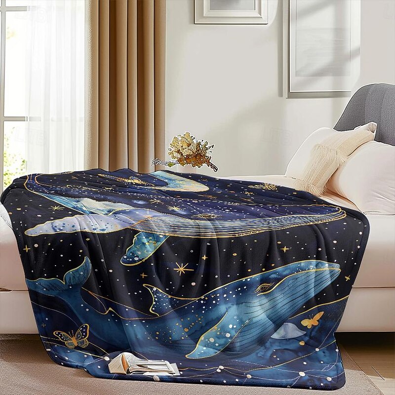 Highlights [Fabric] : Crafted from premium flannel toison and polyester, this throw blanket offers a luscious, soft texture for a cozy and comfortable experience. The high-quality materials promise warmth and durability for use throughout all seasons. [Design] : Featuring a captivating celestial display, this blanket boasts a starry night sky dotted with graceful whales and delicate golden butterflies. The deep navy background provides a stunning contrast to the light blue and gold hues, enhancing its magical ambiance. [Design Highlights] : The blanket utilizes a reactive printing technique with a 3D effect that vividly brings the intricate pattern to life. Its lightweight construction makes it easy to drape or fold, ensuring that it can be effortlessly styled within your living space. [Occasions] : Ideal for adding a touch of whimsy to your home decor, this blanket is perfect for snuggling on chilly evenings or as a decorative piece on beds, sofas, or chairs. Its versatility makes it suitable for any season and occasion, whether relaxing at home or hosting gatherings. [Size Notice] : Available in multiple sizes to fit your needs, including 100x130cm (39x51in), 130x150cm (51x59in), and 150x200cm (59x79in), ensuring the right fit for everyone.