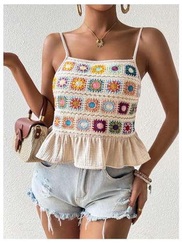 • Features: sleeveless cami top for women, floral, crochet, ruffled, boho, summer peplum top