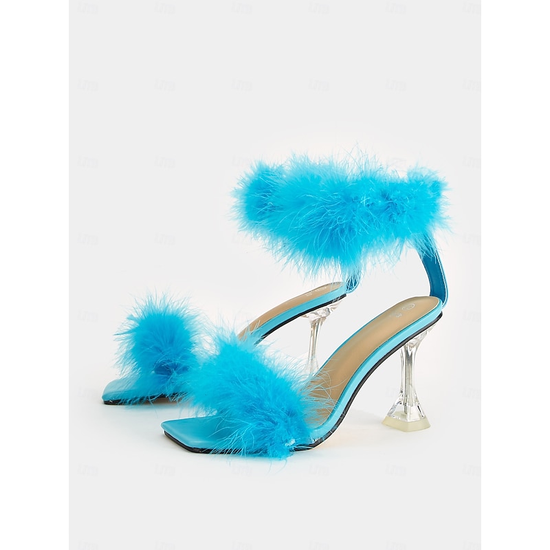 HOT ! Turquoise Feather-Embellished High Heel Sandals with Clear Stiletto Heel for Women – Perfect for Parties and Special Events