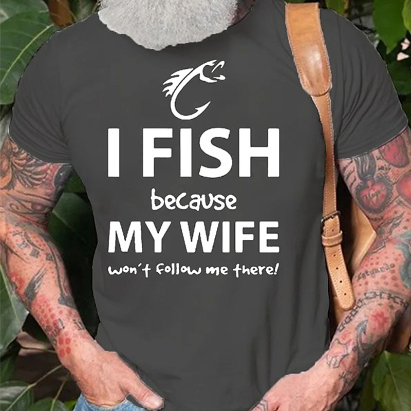 Men's Funny Fishing Graphic Tee: "I Fish Because My Wife Won't Follow Me There!" Husband Humor Shirt 1