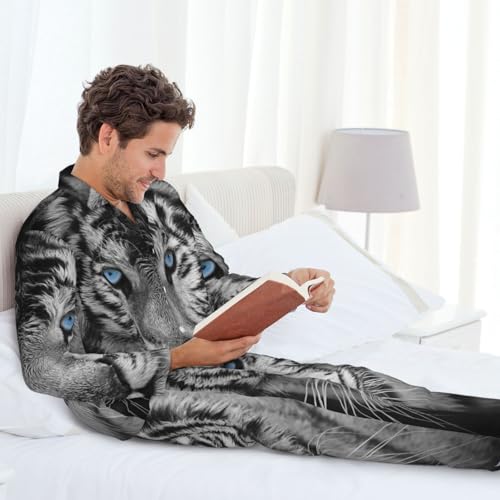 HOT ! White Tiger With Blue Eyes Mens Pajamas Set Button Down Sleepwear Set Long Sleeve Loungewear With Pockets