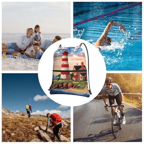 Drawstring Backpack Waterproof Draw String Bag Gym Drawstring Bags Coastal Lighthouse Swim Bag for Men Women 5