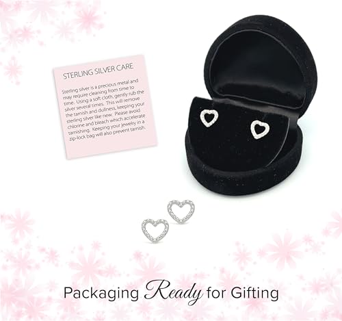 Material: MetalMetal type: Sterling SilverBack Finding: ScrewEarring design: StudGem type: Cubic ZirconiaPREMIUM QUALITY – Earrings are designed using .925 sterling silver and feature a 7mm open heart surrounded by sparkling CZs. They are hypoallergenic and nickel free so they will not irritate sensitive ears. These make a timeless keepsake she will treasure forever.SCREW BACKS – Crafted with screw-on backs that stay comfortably in place keeping them secure so they can't get lost. They also have shortened posts so they protect the backs of their little earsKEEPSAKE GIFT – Timeless children’s jewelry for girls of all ages and make special gifts for newborn babies, infants, toddlers, girls, and best friend. Great for Valentines Day gift, flower girls, birthday, BFF, or for that special granddaughter. Matching necklace is also available.GIFT BOX – Each pair of our earrings arrives in a charming heart-shaped gift box, complete with care instructions—making gift giving easy and memorableSAFETY – Earrings have been tested by a certified lab to ensure they meet all U.S. safety guidelines. They are free of lead, cadmium, and nickel—so you can feel confident choosing them for even the most sensitive little ears. excellent for everyday use. supreme materials and excellent craftsmanship ensure long-lasting durability.