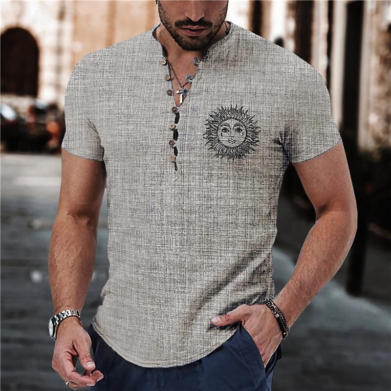 Stand out with the artistic sun pattern print on the left chest and a classic Henley-style neckline adorned with wooden buttons for a hint of rustic charm. The short sleeves and stand collar add a modern touch, perfect for a trendy streetwear look.
