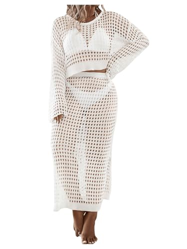 GORGLITTER Women's Plus Size 2 Piece Crochet Cover Ups Long Sleeve Knitted Hollow Out Skirt Set Beachwear 2
