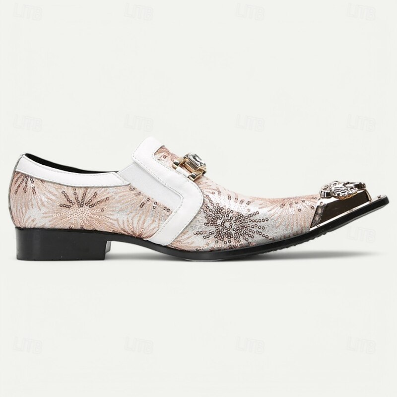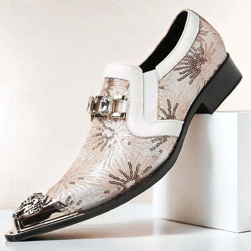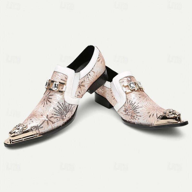 HOT ! Men's Premium Cowhide Leather Loafers with Gold Tip Sequined Floral Design and Crystal Buckle Detail–Luxury Slip-On Shoes for Special Occasions and Evening Wear