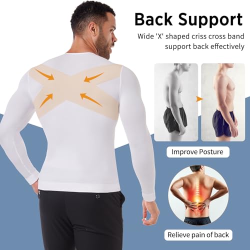 • [POWERFUL BACK SUPPORT] The long sleeve body shaper features ergonomic criss-cross bands relieve pressure on shoulder and provide support for back. Our stomach compression shirt helps to improve posture, relieve back pain and accelerate post-surgery recovery. Meanwhile it will open your chest, boost confidence and make you a man full of charm.
