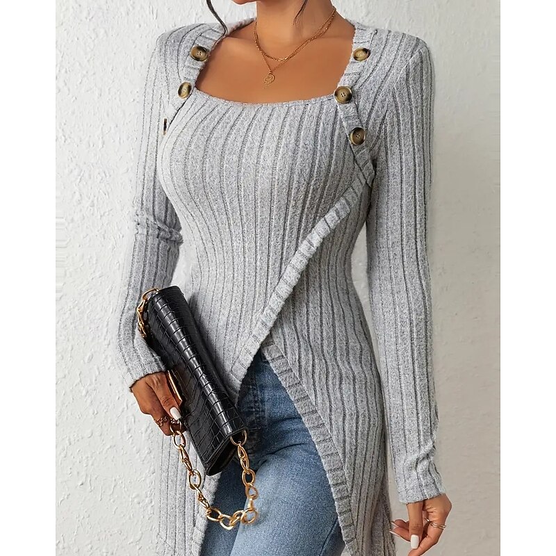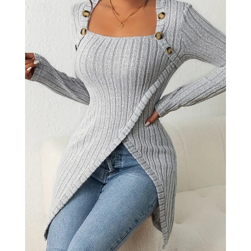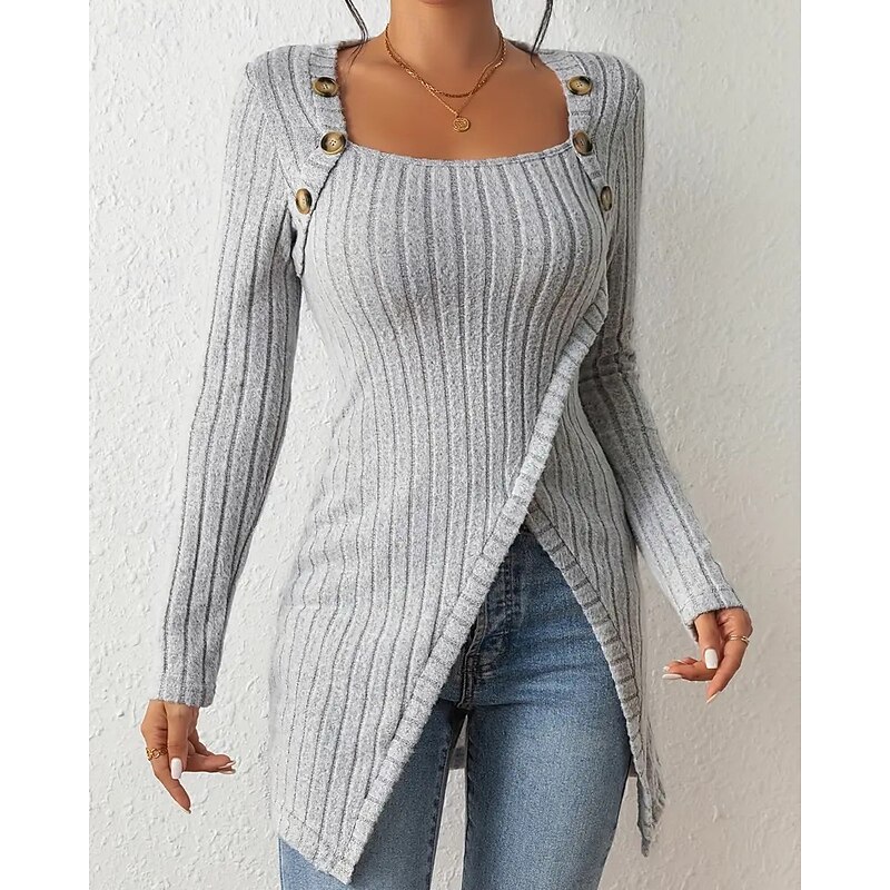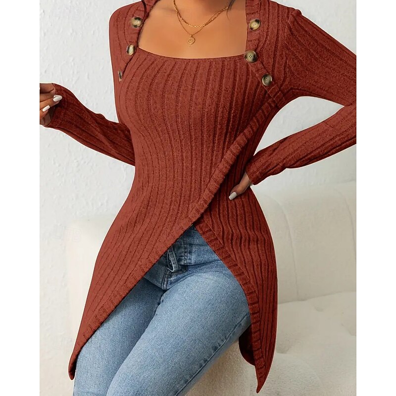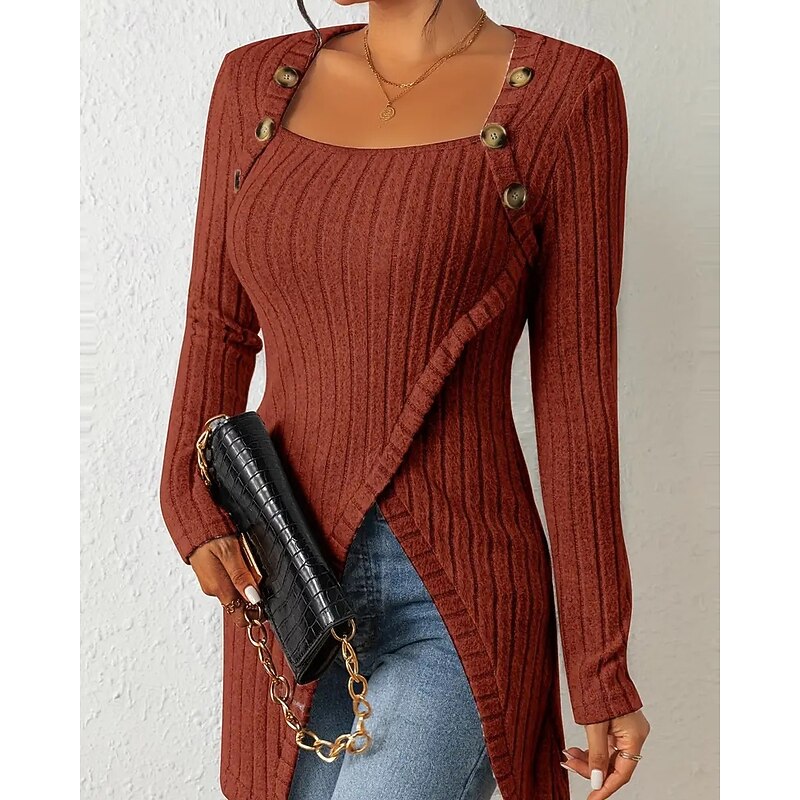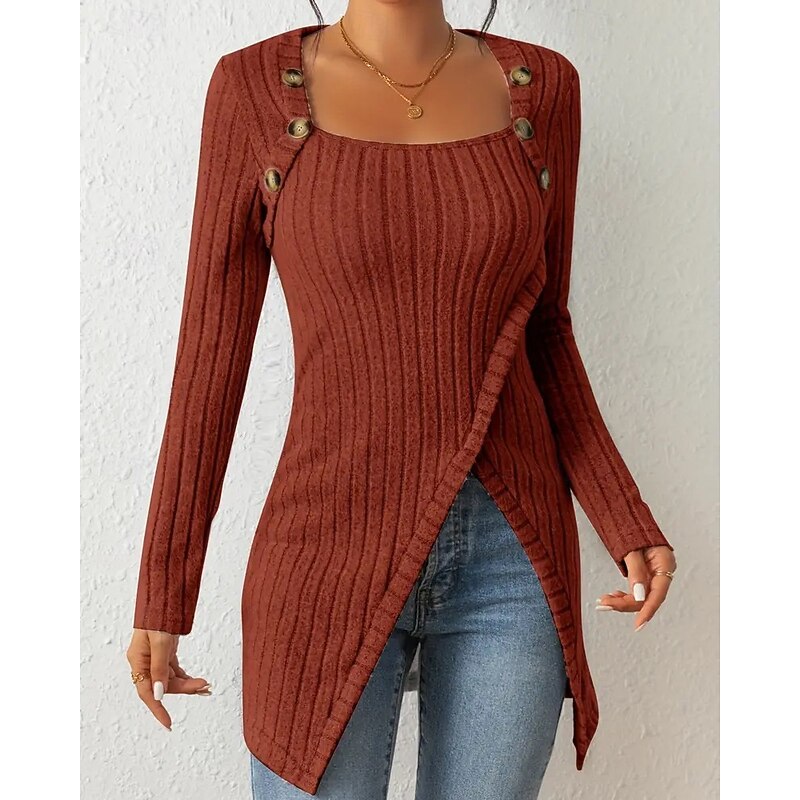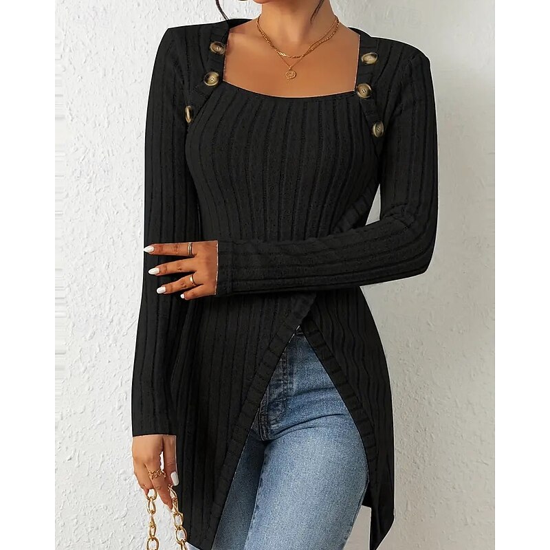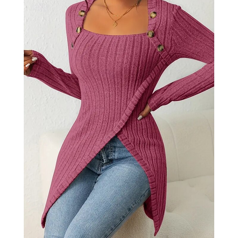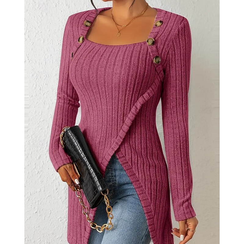 HOT ! Women's T Shirt Tee Top Solid Color Elegant Fashion Long Sleeve Square Neck Regular Tops Daily Weekend Buttons Asymmetrical Black Brown Rose Pink Gray Spring Fall