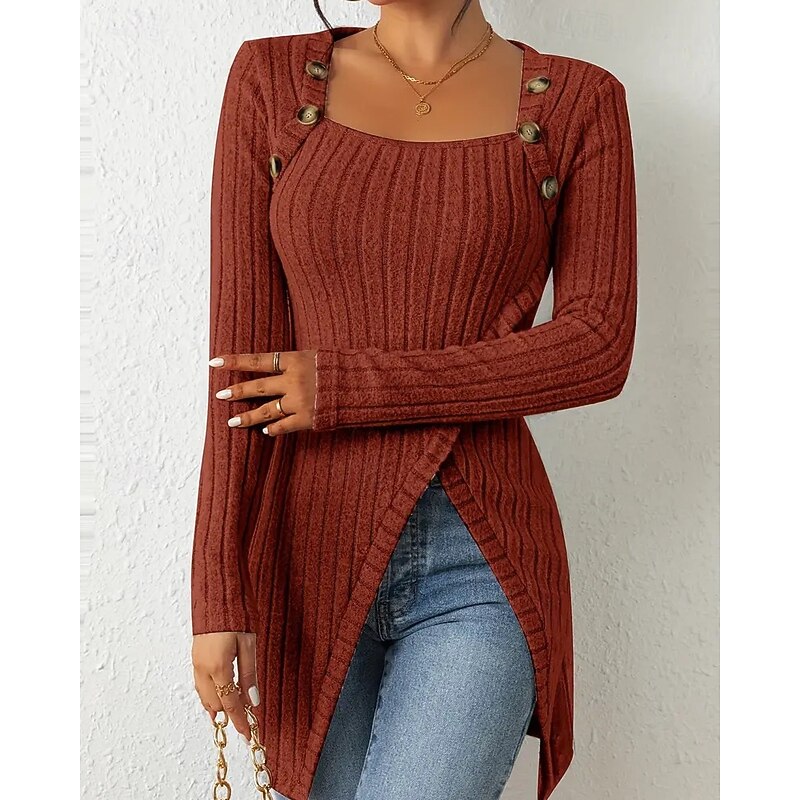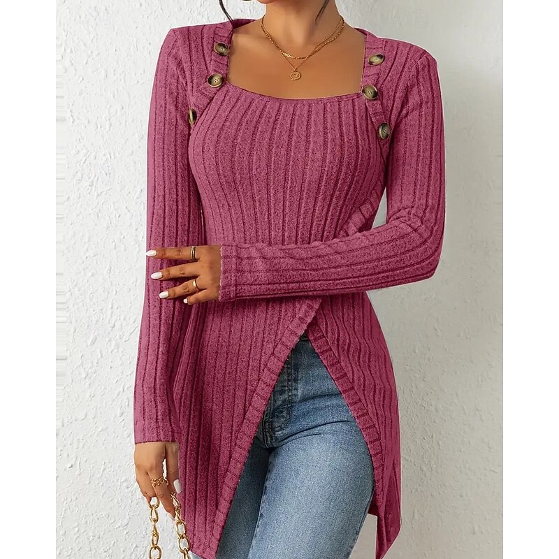 Women's T Shirt Tee Top Solid Color Elegant Fashion Long Sleeve Square Neck Regular Tops Daily Weekend Buttons Asymmetrical Black Brown Rose Pink Gray Spring Fall 24
