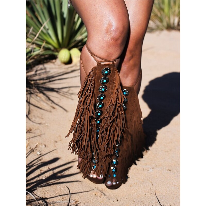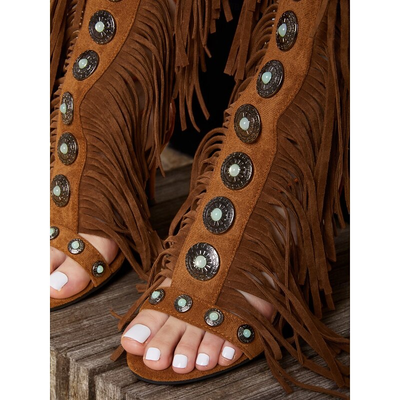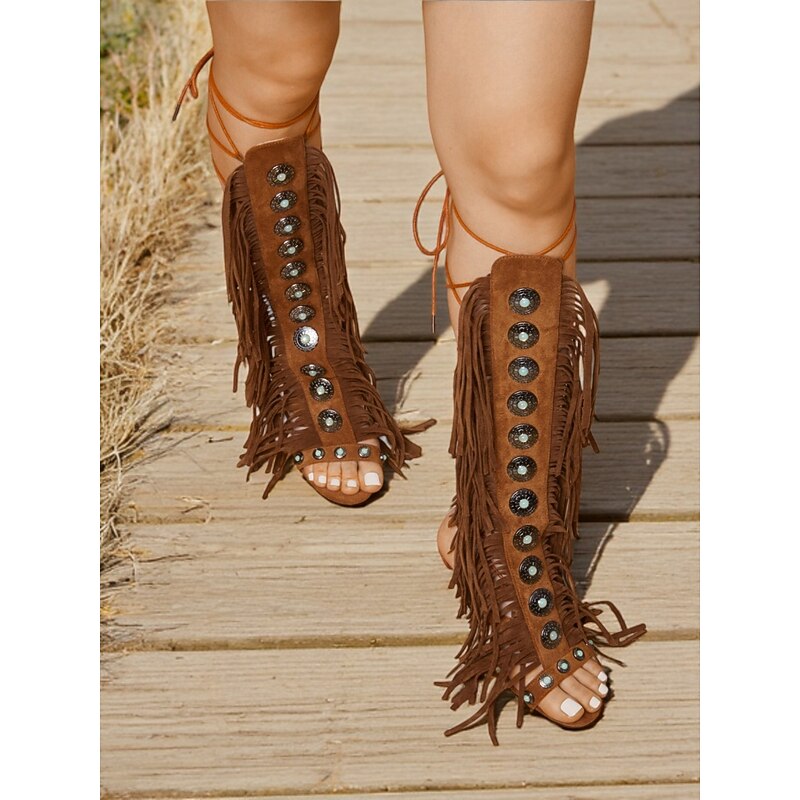 Women's Brown Boho Fringe Gladiator Heeled Sandals – Western Style Knee-High Lace-Up Boots for Music Festivals, Summer Parties & Retro Fashion 1