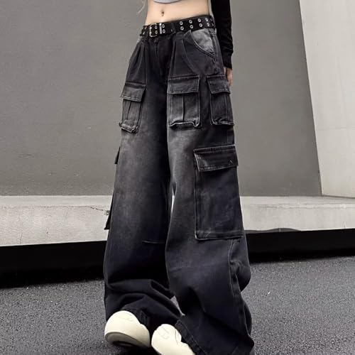 More information about Summer Plus Size Baggy Straight Wide Leg Jeans for Women Unisex Washed Black Multi-Pocket Cargo Denim Pants