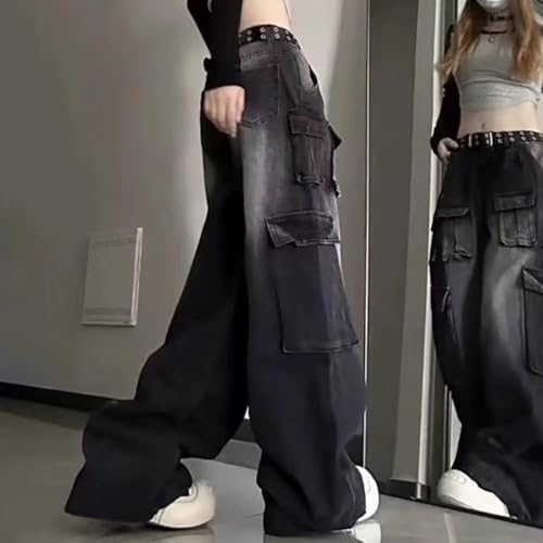 HOT ! Summer Plus Size Baggy Straight Wide Leg Jeans for Women Unisex Washed Black Multi-Pocket Cargo Denim Pants