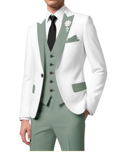 • 【Color - Block Tailoring】This men's suits regular fit 3 Piece breaks traditional single - tone. Bold White & bright (beige/green/blue/orange/red/brown/pink/white) blocks on peak lapels, vest, pockets of the tuxedo suit set. With crystal/pearl brooch, no extra boutonniere needed. Boosts elegance for galas/ceremonies, making the slim fit suit for men stand out.