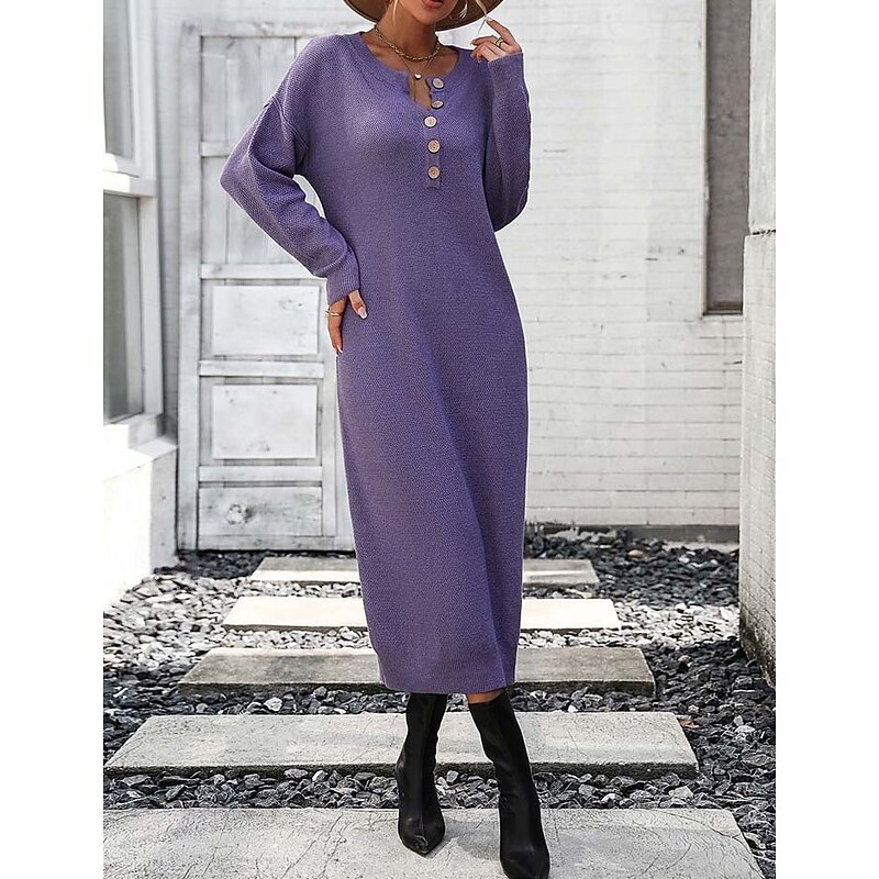 Highlights [Fabric] This Women's Sweater Dress is crafted from a high-quality knit fabric that blends comfort and elegance, making it a perfect choice for the fall and winter seasons. The material provides warmth while maintaining a sleek appearance, suitable for various settings. [Silhouette] The dress features a loose fit design for ease of wear, complemented by its long sleeve construction and crew neckline, offering both style and practicality in cooler weather. [Design Highlights] Accentuated by stylish decorative buttons running along the front, this dress boasts an understated chic appeal. It includes a wide, adjustable belt with a prominent buckle to cinch the waist, highlighting the wearer's feminine silhouette. The midi-length cut adds versatility to its style, allowing for both casual and formal applications. [Occasions] This versatile sweater dress is perfect for work settings, casual outings, and elegant gatherings. Pair it with high-heeled boots and a fashionable handbag for a complete, sophisticated look that stands out in any event. [Size Range] Available in sizes S, M, L, and XL, this dress accommodates a range of body types, ensuring a flattering fit for every woman. The dress comes in solid colors including Black, Beige, and Purple, offering options to suit personal style preferences.