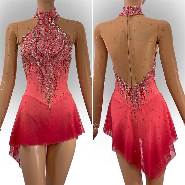 More information about Figure Skating Dress Women's Girls' Ice Skating Dress Red Thumbhole Asymmetric Hem Mesh High Elasticity Training Competition Skating Wear Classic Crystal / Rhinestone Long Sleeve Ice Skating Figure
