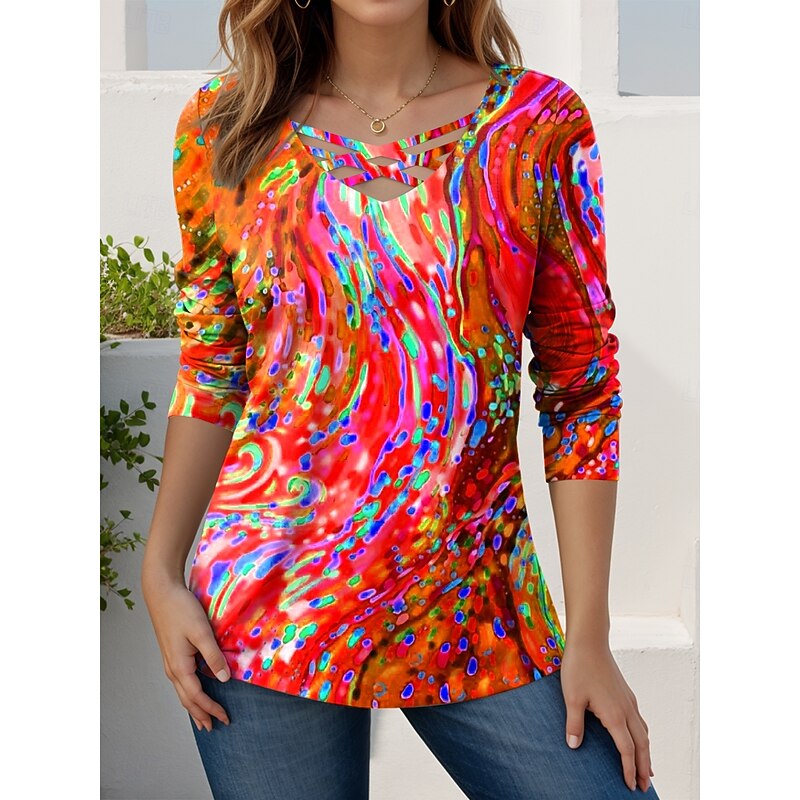 More information about Women's T Shirt Graphic Geometric Abstract Stylish Modern Casual Long Sleeve V Neck Regular Tops Daily Cut Out Print Red Blue Purple Green Spring Fall