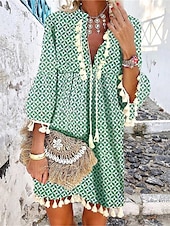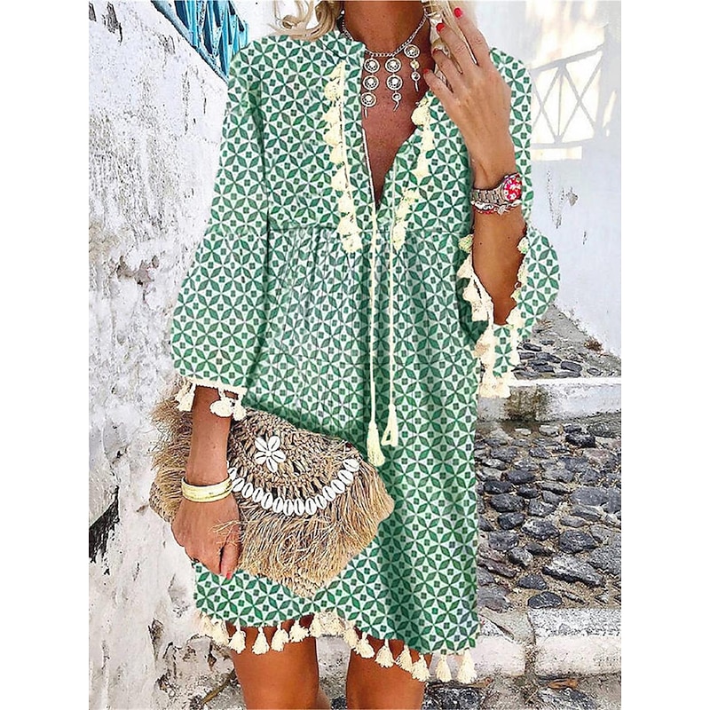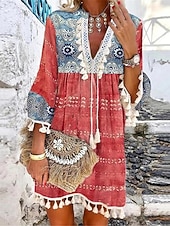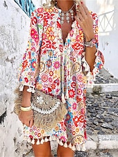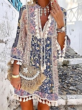 : Showcasing a bohemian and ethnic flair, this dress is adorned with vibrant floral and geometric prints. The split neckline is highlighted with intricate lace and tassel details, while the three-quarter-length sleeves end with tassel embellishments at the cuffs, contributing to its carefree and chic aesthetic.