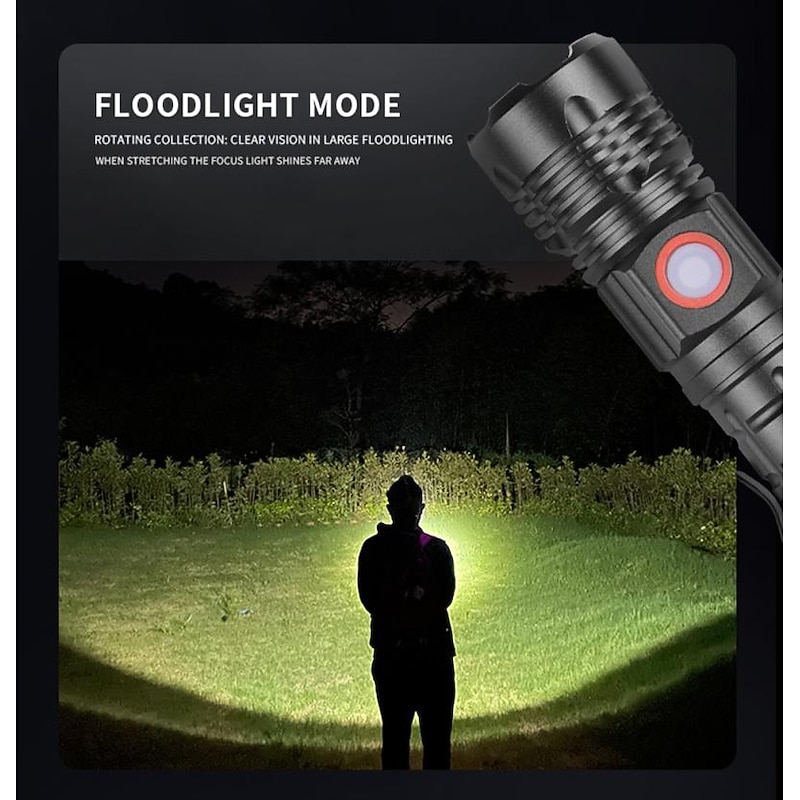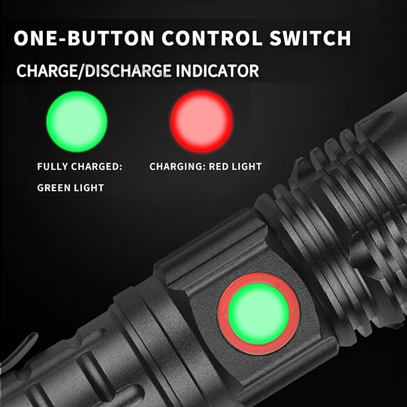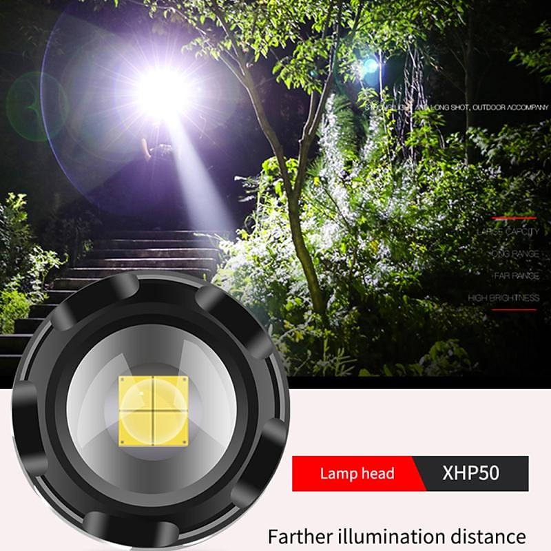 Highlights - Equipped with XHP50 lamp beads for brightness up to 2000 lumens and a service life of 100,000 hours - Ideal for hunting, adventure, and other outdoor activities - Power reminder function to know the flashlight's power status anytime, anywhere - Waterproof in accordance with IPX-4, can be used in rainy weather (cannot be placed in water) - Battery capacity display with micro USB charging capability - Suitable for work, hunting, climbing, fishing, camping, and outdoor activities - Package includes LED flashlight and USB charging cable - XHP50 flashlight Kit includes high-quality 18650 battery (1200mAh), LED flashlight, and USB charging cable - Features: Waterproof