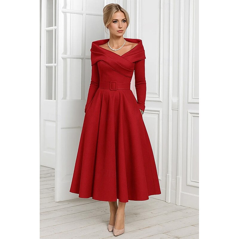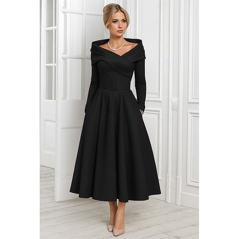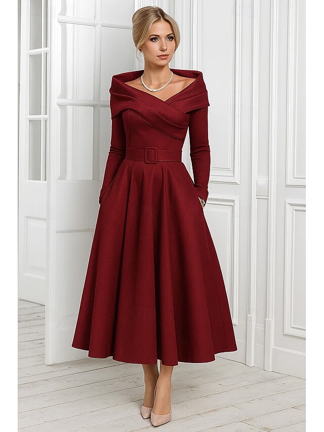 More information about A-Line Cocktail Dresses Elegant Formal Dress Formal Wedding Tea Length Long Sleeve Off Shoulder Stretch Satin with Pleats 2025