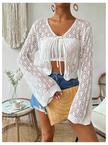 HOT ! SweatyRocks Women's Tie Front Crop Cardigan Hollow Out Long Sleeve Lightweight Knit Tops