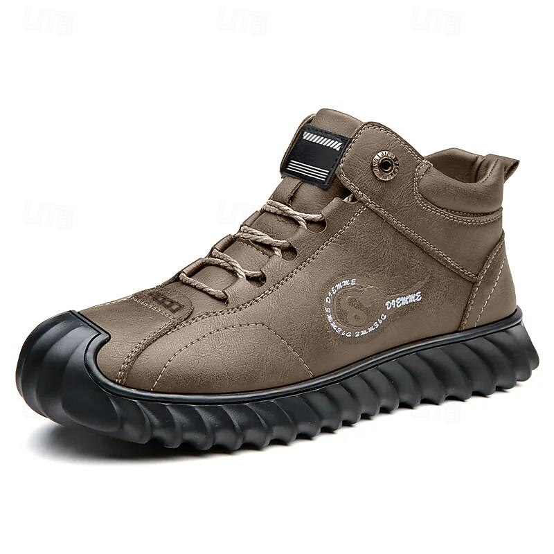 Highlights [Men's Black Faux Leather Ankle Boots:] [Fabric & Materials:] Crafted from premium black faux leather, these boots offer a luxurious appearance and durable construction, making them ideal for long-lasting wear. The upper leather material not only provides style but also enhances the boot's resistance to various environmental conditions. [Fit & Design:] The boots showcase a classic lace-up closure, allowing for a customized and secure fit. The inclusion of metallic eyelets adds a contemporary touch, while the embossed logo subtly enhances the modern aesthetic. Featuring a warm plush lining, these boots ensure comfort and warmth, perfect for colder months. [Design Highlights:] Key design elements include the rugged non-slip rubber sole, engineered for superior grip and traction across multiple terrains. The wave-like tread pattern not only emphasizes a stylish edge but also prioritizes safety and practicality for outdoor activities. [Occasions & Usage:] These versatile ankle boots are perfect for a range of settings, including daily wear and outdoor adventures. Whether you're navigating city streets or enjoying a weekend escape, they offer the ideal combination of fashion and function, tailored for cold weather. [Size Range:] Available in a variety of sizes to ensure the perfect fit, accommodating a wide range of men's foot sizes. These boots are designed for those seeking stylish, comfortable, and practical footwear solutions for the fall and winter seasons. They also cater to trends in comfort shoes and winter boots for 2024.