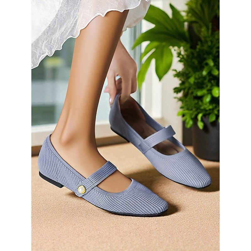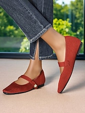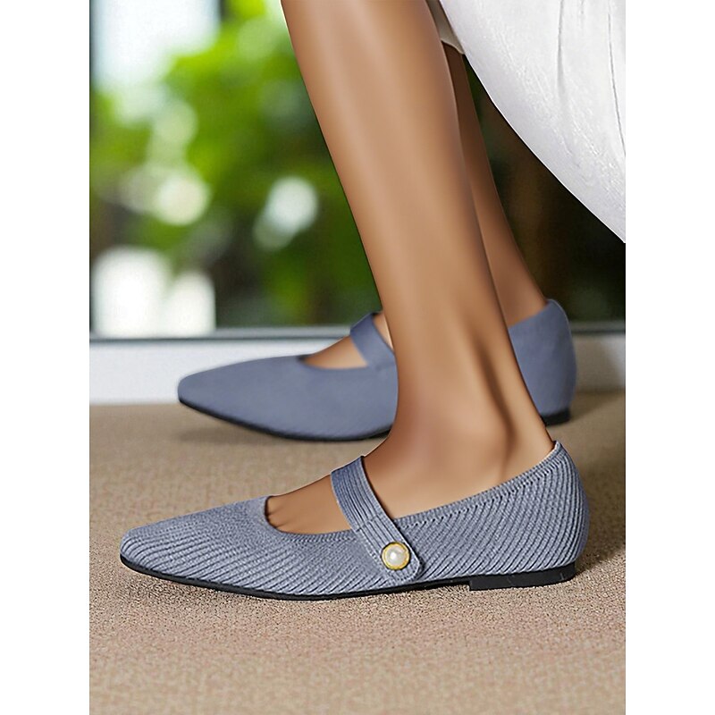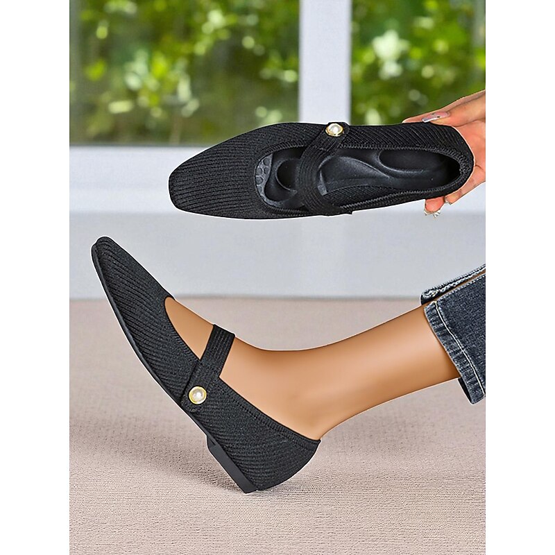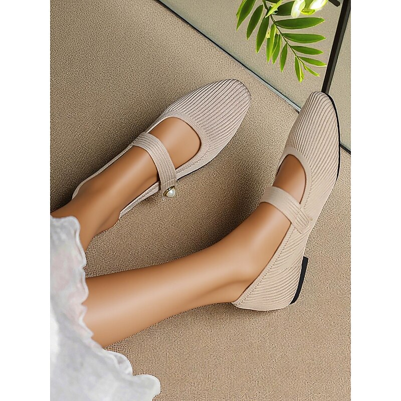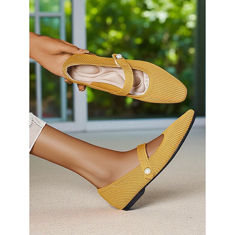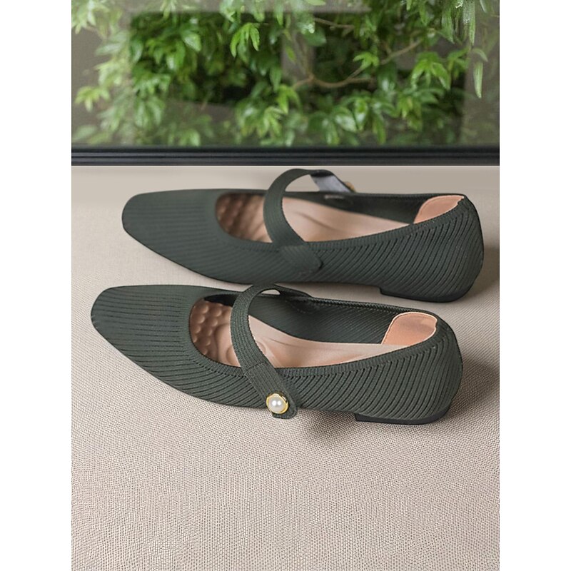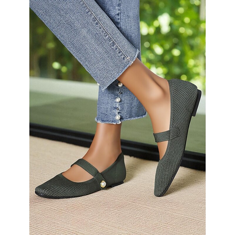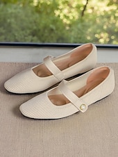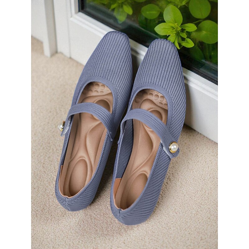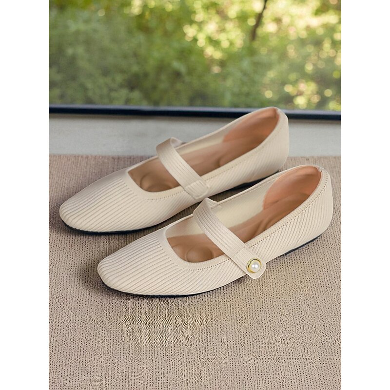 HOT ! Women's Beige Knit Mary Jane Flats with Pearl Strap - Lightweight Breathable Casual Shoes for Daily Wear,Travel and Office Outfits