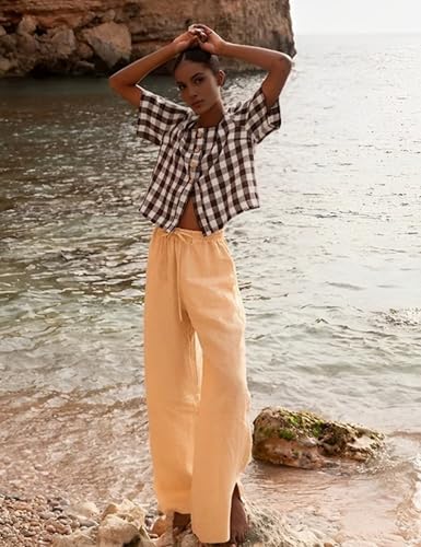 PUWEI Women's Plaid Button Down Shirts Cotton Short Sleeve Square Neck Gingham Tops Blouses 5