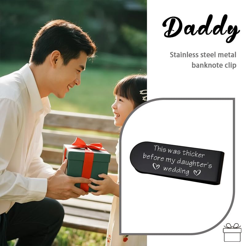 • Engraved Money Clip for Men Dad Father Daddy from Daughter Son: This dad stainless steel money clip engraved with: This was thicker before my daughter's wedding, which can make dad very happy as funny gifts for men dad daddy father, also you can use it as father of the bride gifts from daughter or father of bride gift for men dad father daddy
