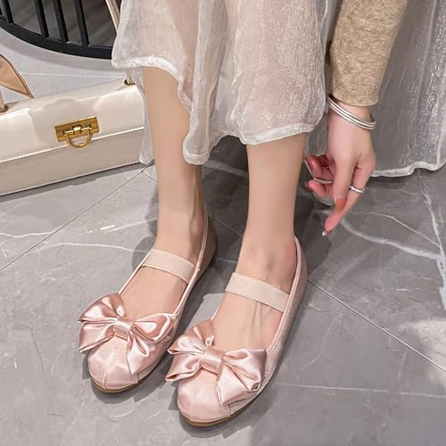 Dear Time Bowknot Satin Ballet Flats Elastic Strap Cute Round Toe Shoes Slip on Pink Size 10 5