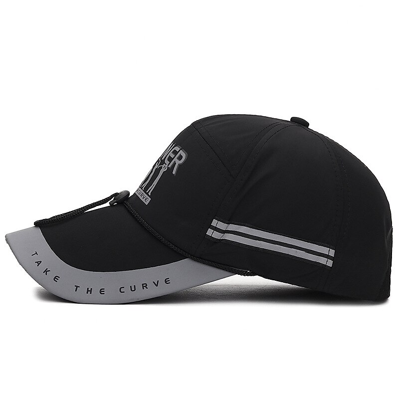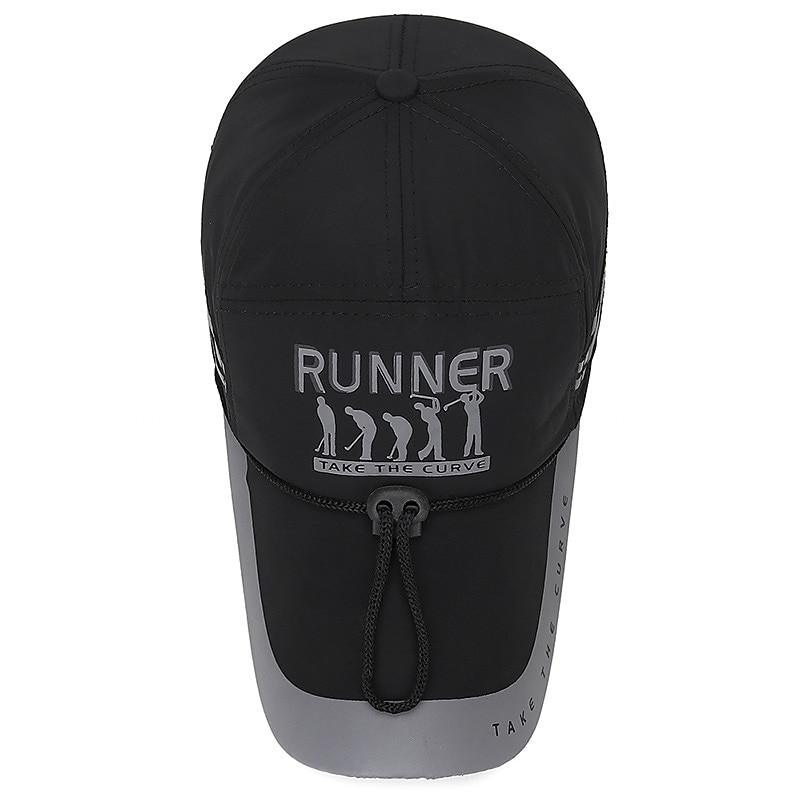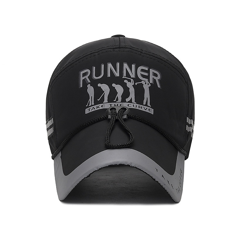 Highlights [Fabric:] Made from lightweight, durable polyester, this men's baseball cap offers excellent breathability and comfort, perfect for extended wear during outdoor activities. [Fit:] Designed with a curved brim and an adjustable strap, this cap ensures a customizable fit that suits head sizes ranging from 55-60cm, providing both style and practicality. [Design Highlights:] The cap features a sleek black and red color scheme, enhanced by a reflective strip that adds visibility and a modern touch. The front showcases a bold "RUNNER" graphic along with silhouette details, while decorative stripes on the side enhance its sporty appeal. [Occasions:] Ideal for vacations, outdoor adventures, and casual outings, this cap is a versatile accessory that complements a variety of seasonal activities, from beach trips to travel excursions. [Size Range:] Available in one size, accommodating head sizes from 55-60cm, ensuring a perfect fit for most individuals.