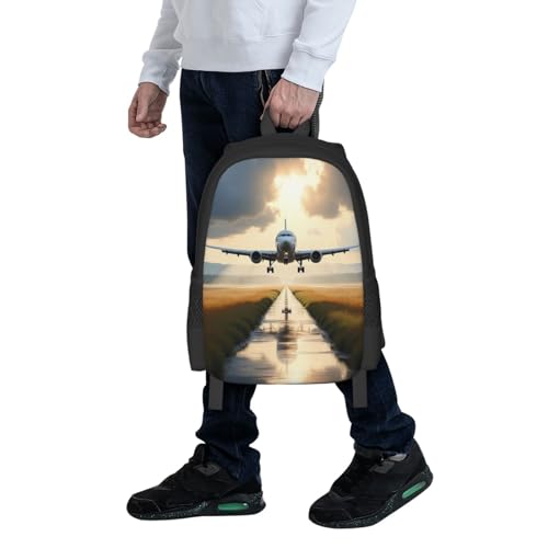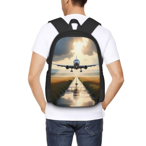HOT ! Airplane On Runway Cloudy Sky Water Reflection Backpack Build Casual Daily Outdoor Adventures Camping & Hiking Trips 17 In