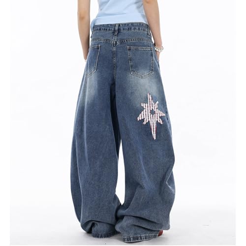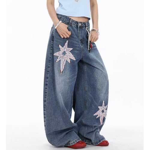 HOT ! Vintage Casual High Waisted Baggy Star Jeans Y2K Cute Graphic Patchwork Design Straight Leg Denim Pants