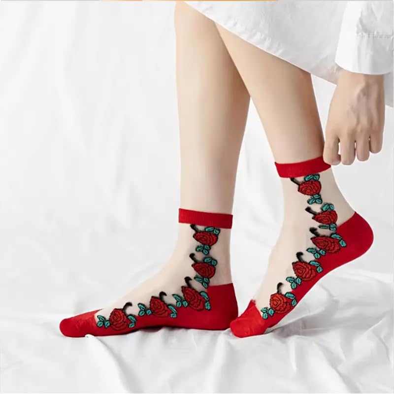 More information about 3 Pairs Red Rose Pattern Mid-Calf Socks For Women, Elegant, Comfortable And Romantic Lace Trim Design With Floral Embroidery, Romantic Accessories