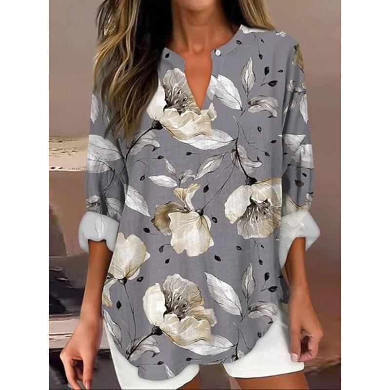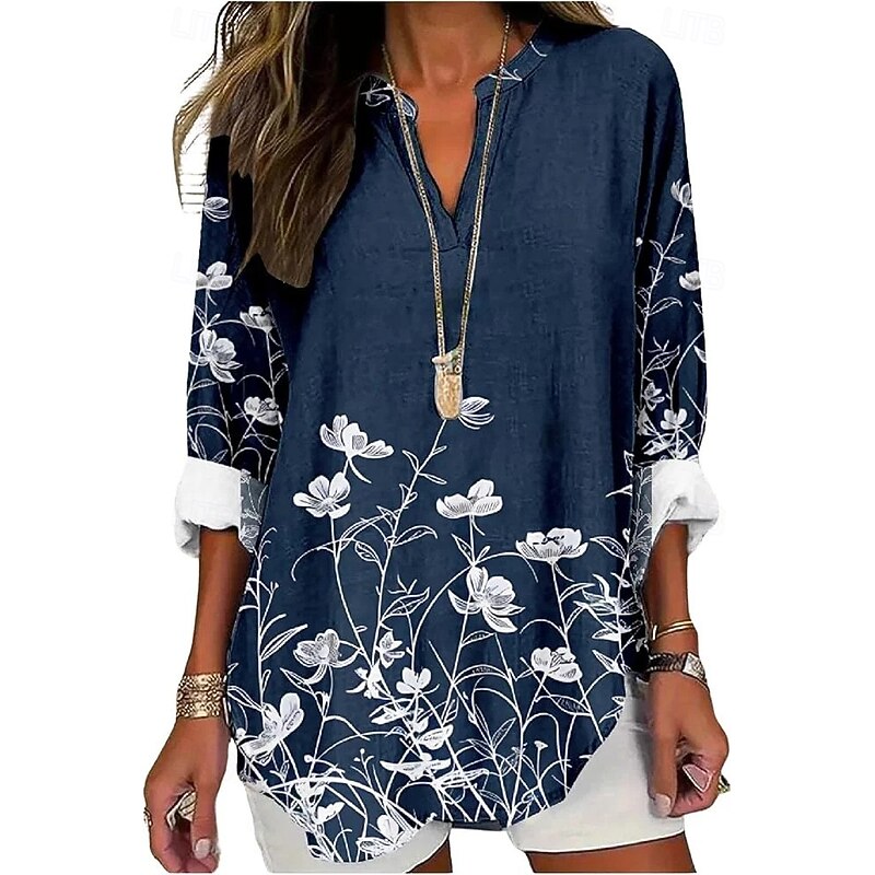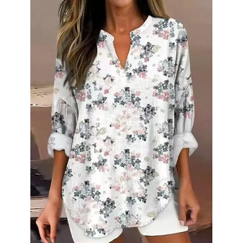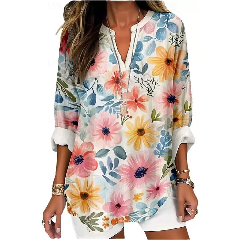 Women's Boho Shirt Floral Graphic Bohemia Daily Casual Long Sleeve V Neck Regular Tops Daily Holiday Going out Patchwork Print White Yellow Wine Navy Blue Dusty Blue Spring, Fall, Winter, Summer 23