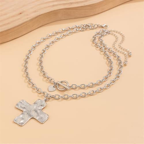 Gold Layered Chunky Cross Necklace for Women,Punk Vintage Hammered Big Cross Heart Pendant Neckalce Statement Thick OT Buckle Chain Necklace Fashion Jewelry 6