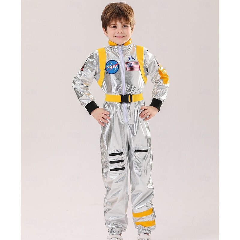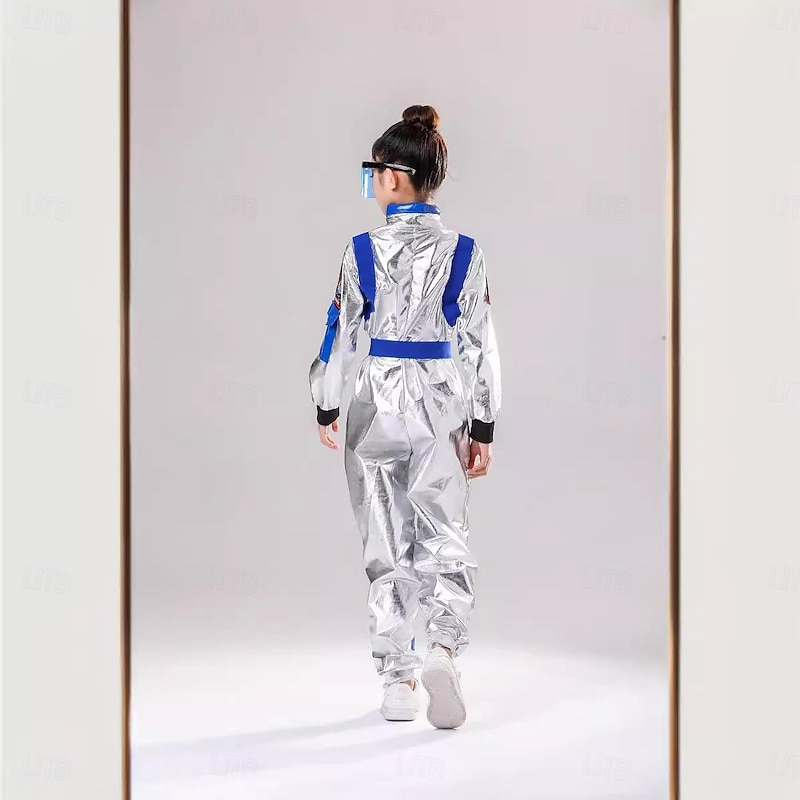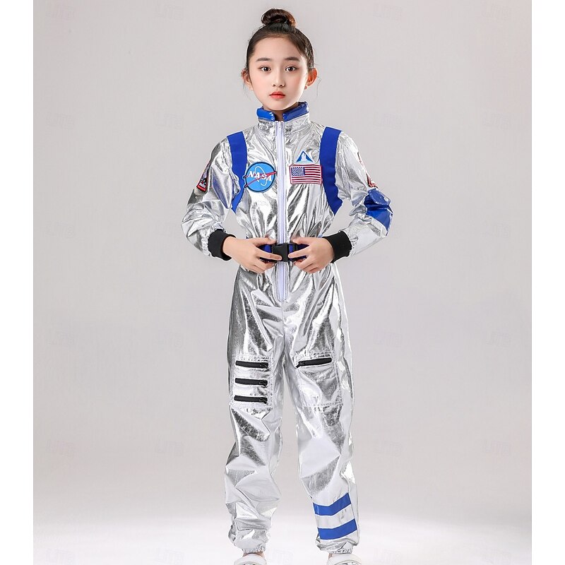 Highlights [Fabric] These astronaut carnival costumes for kids are made from a lightweight and durable polyester blend that mimics the look of real space suits. The fabric features a shiny, metallic silver finish that is both eye-catching and comfortable for active play. [Fit] Designed with a straight, relaxed fit, these jumpsuits include micro-elastic properties for added comfort. Elastic cuffs at the wrists and ankles ensure a secure fit, allowing kids to move freely without restriction during playtime or parties. [Design Highlights] Authentic style patches enhance the realistic astronaut look, featuring a national flag emblem and an iconic space agency logo. The costumes also feature vibrant, integrated belts in blue and yellow for an adjustable waist fit and a front zipper closure from neck to waist for easy dressing. The sleek blue-tinted visors add an extra layer of authenticity and fun to the space explorer theme. [Occasions] These astronaut costumes are perfect for a variety of occasions, including themed parties, evening events, imaginative play, and educational experiences. Whether for a carnival or a party, these costumes bring a touch of adventure and excitement. [Size Range] Available in sizes suitable for kids ages 5 to 10, the costumes come in 5-6 years (130 cm), 7-8 years (140 cm), and 9-10 years (150 cm), ensuring a comfortable fit for both boys and girls.