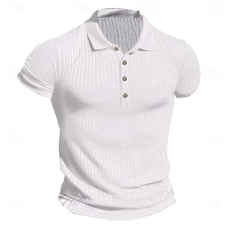 Highlights [Fabric] : Crafted from a blend of high-quality polyester and a slightly stretchy fiber, this men's golf shirt offers a rich, velvety texture that ensures both comfort and durability. The fabric features a unique vertical ribbed pattern, adding an elegant touch to its appearance. [Fit] : Designed with a regular fit, this polo shirt accentuates the physique while providing ease of movement, suitable for both casual and smart-casual occasions. The short sleeves are fitted to enhance its sleek silhouette, making it an ideal choice for warm-weather wear. [Design Highlights] : Featuring a classic lapel collar and a button placket, this shirt combines traditional elements with a modern flair. The horizontal stripe pattern adds a subtle dynamic to the overall design, while the earthy color palette including White, Navy Blue, Light Grey, and Khaki offers timeless versatility. [Occasions] : This polo shirt is perfect for holidays, casual outings, sports events, or professional work settings. Its versatile design allows it to be paired effortlessly with a range of trousers or jeans, making it a staple piece for spring and summer wardrobes. [Size Range] : Available in a broad range of sizes from S to 5XL, ensuring a comfortable fit for various body types and preferences.
