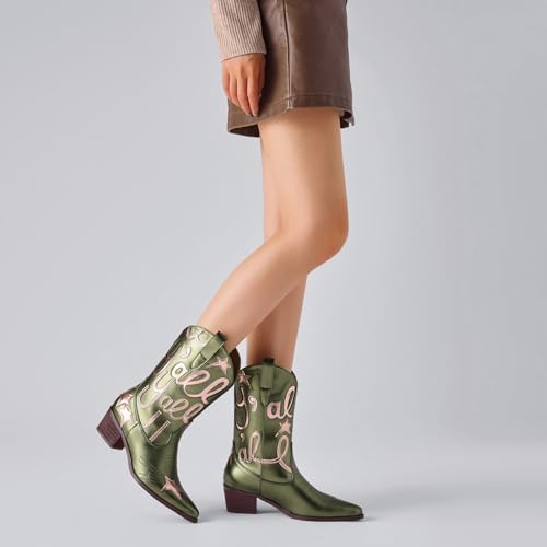 Metallic Cowboy boots for Women Embroidered Mid Calf Womens Cowgirl Boots Western Pointed Toe Chunky Heel 5