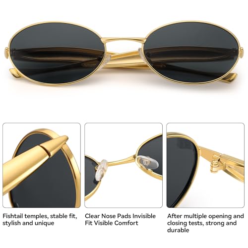 • FASHION GOLD FRAME:Finished with a polished gold frame, trendy sunglasses elevate your style with a touch of vintage glam. The refined metallic shine adds a luxurious detail while keeping your overall look clean and latest,The oval frame is unisex and flatters every face shapes,Ideal for sharing or gifting