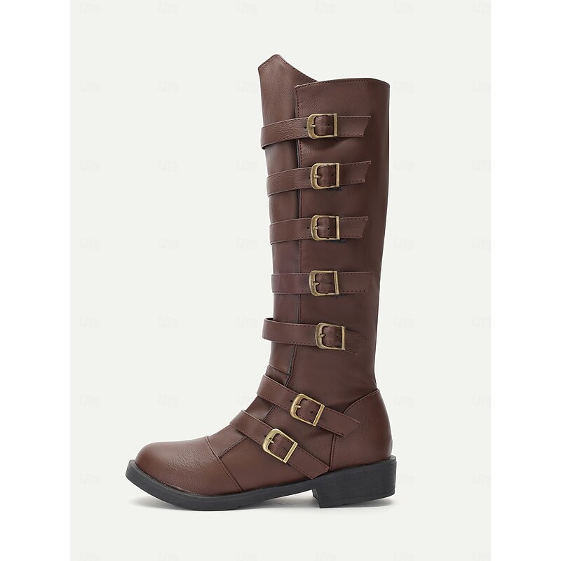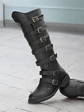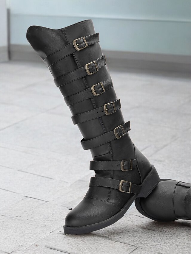 Highlights [Fabric] : Expertly crafted from high-quality PU with a textile lining, these knee-high boots offer a luxurious feel and rugged durability, excellent for long-lasting wear throughout the seasons. [Silhouette] : Featuring a sleek and streamlined silhouette, these boots boast a vintage-inspired look with a contemporary twist, emphasized by a bold chunky heel and a round toe design that perfectly brings together style and comfort. [Design Highlights] : The standout design incorporates multiple straps and robust metal buckles that run along the length of the boot, adding both decorative flair and functional security. The structured outsole ensures stability, making them ideal for both outdoor adventures and daily wear. [Occasions] : Perfect for a variety of settings including daily wear and work, these boots seamlessly blend into casual or vacation settings with their vintage and biker boot-inspired style, making them a versatile addition to any wardrobe. [Size Range] : Available in sizes ranging from US5.5 to US10.5, we recommend choosing your usual size for the perfect fit. Designed to cater to a broad spectrum of foot sizes, these boots provide both style and comfort without sacrificing fit. Perfect for everyday use. supreme materials and excellent craftsmanship ensure long-lasting durability.