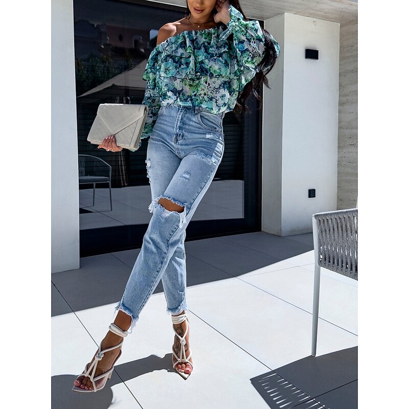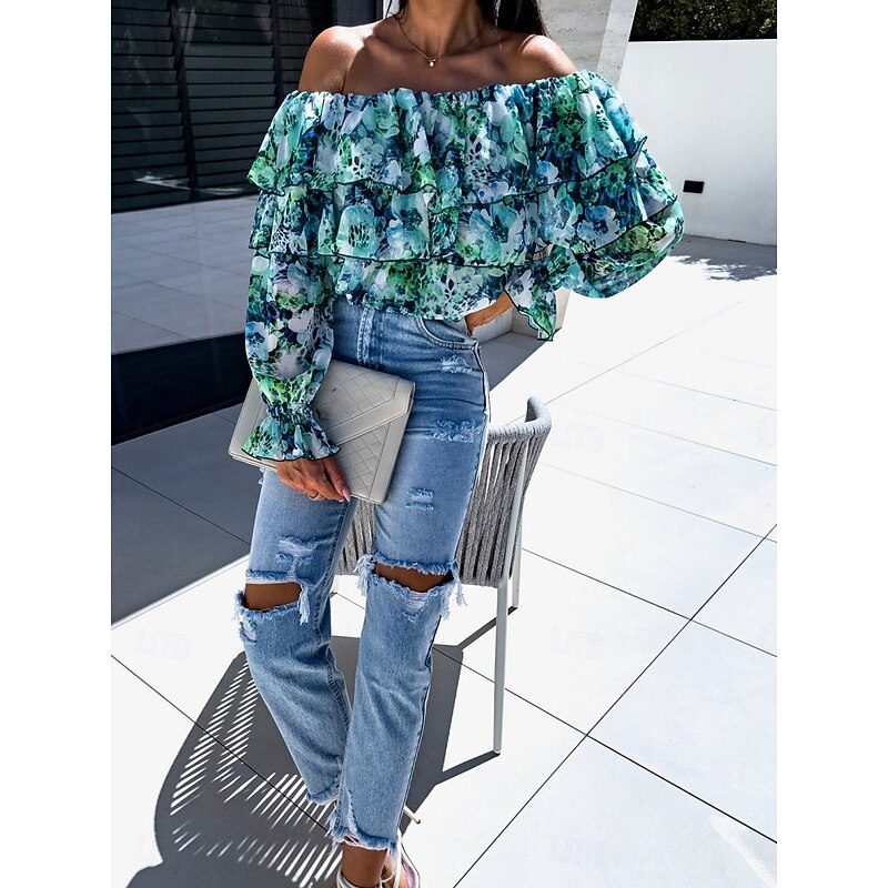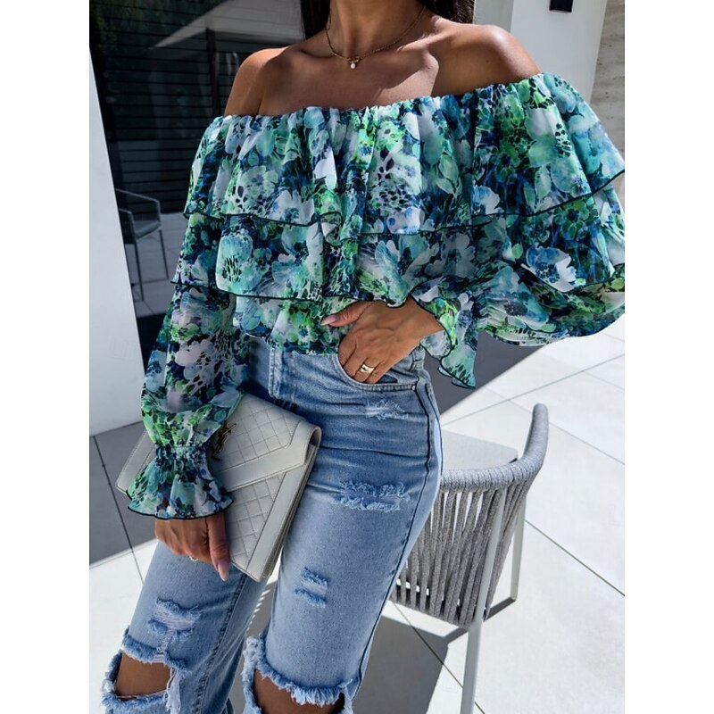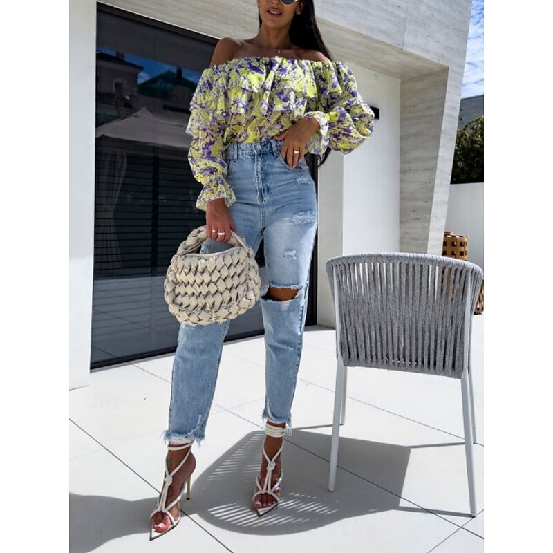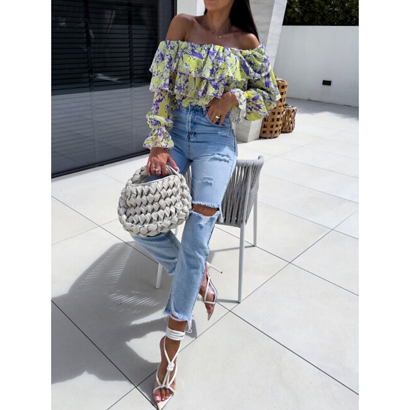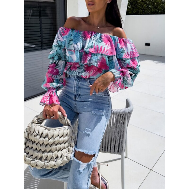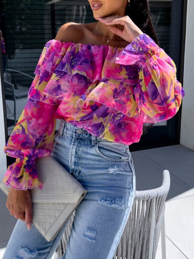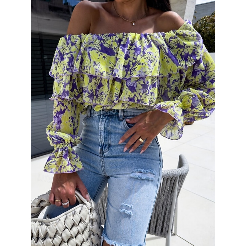 HOT ! Women's Shirt Blouse Floral Leaf Stylish Casual Long Sleeve Off Shoulder Regular Tops Daily Ruffle Print Yellow Pink Purple Green Summer Spring