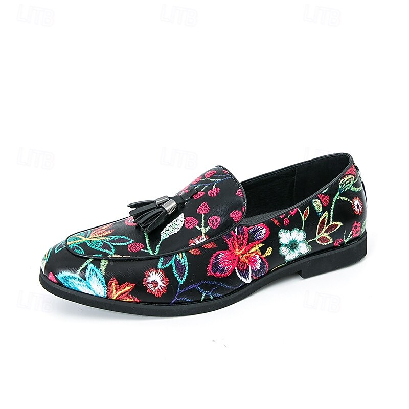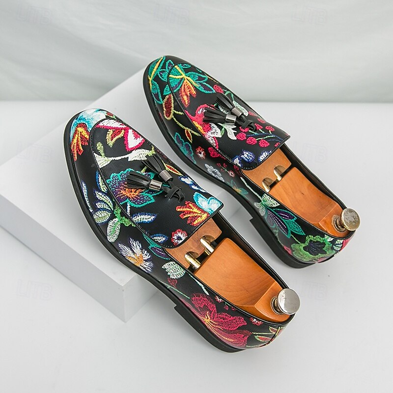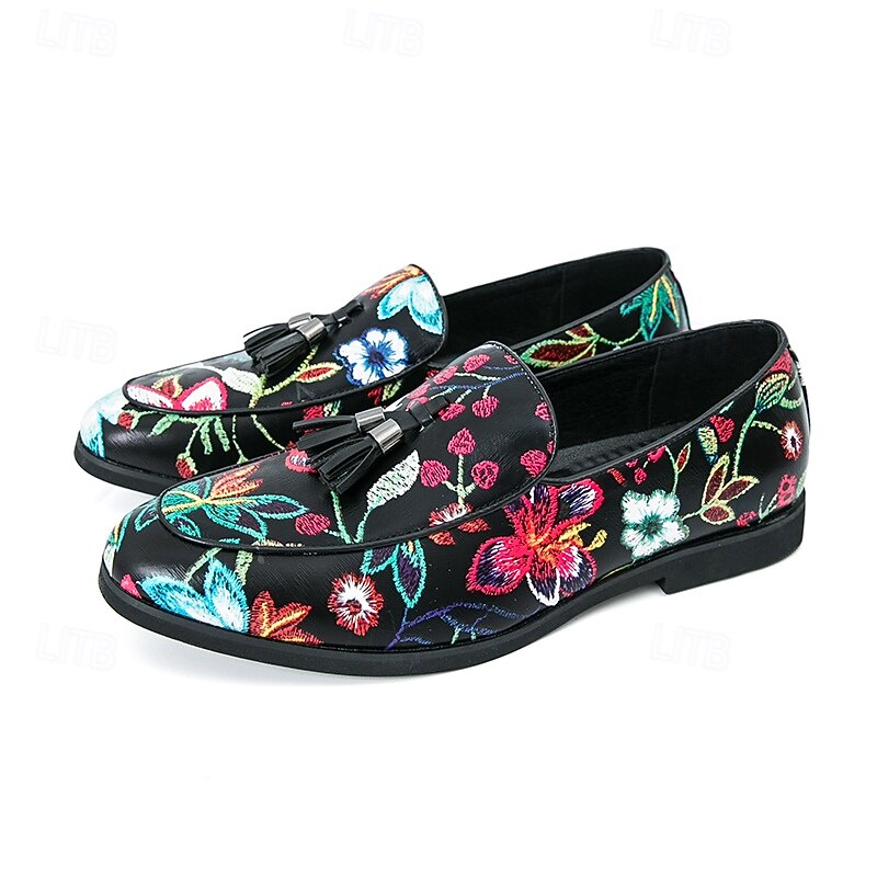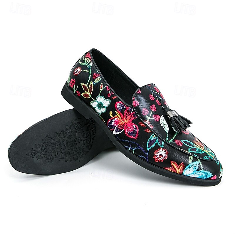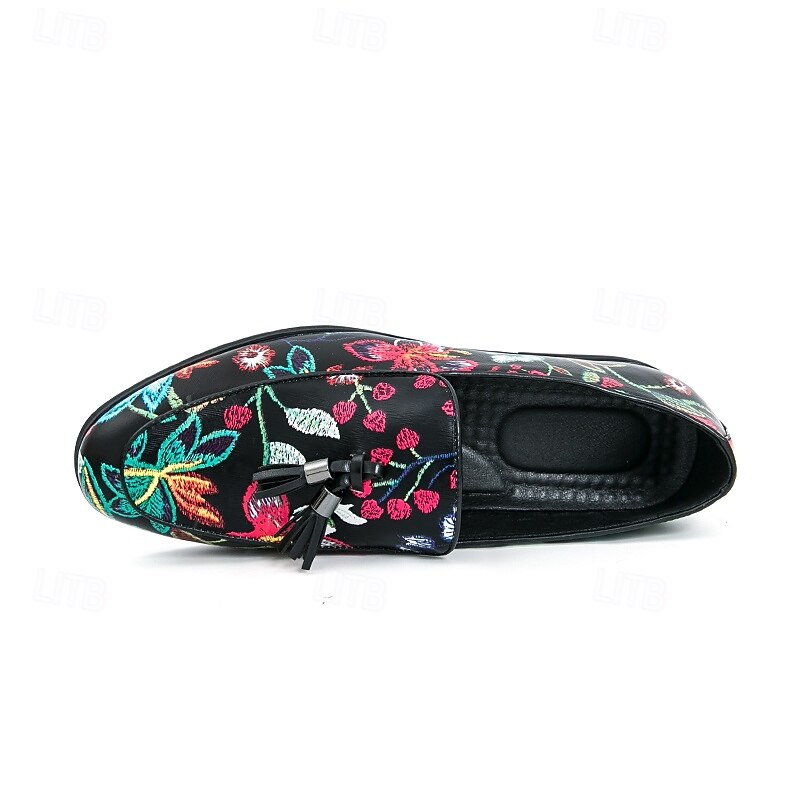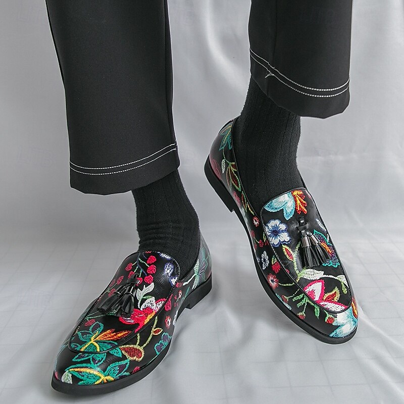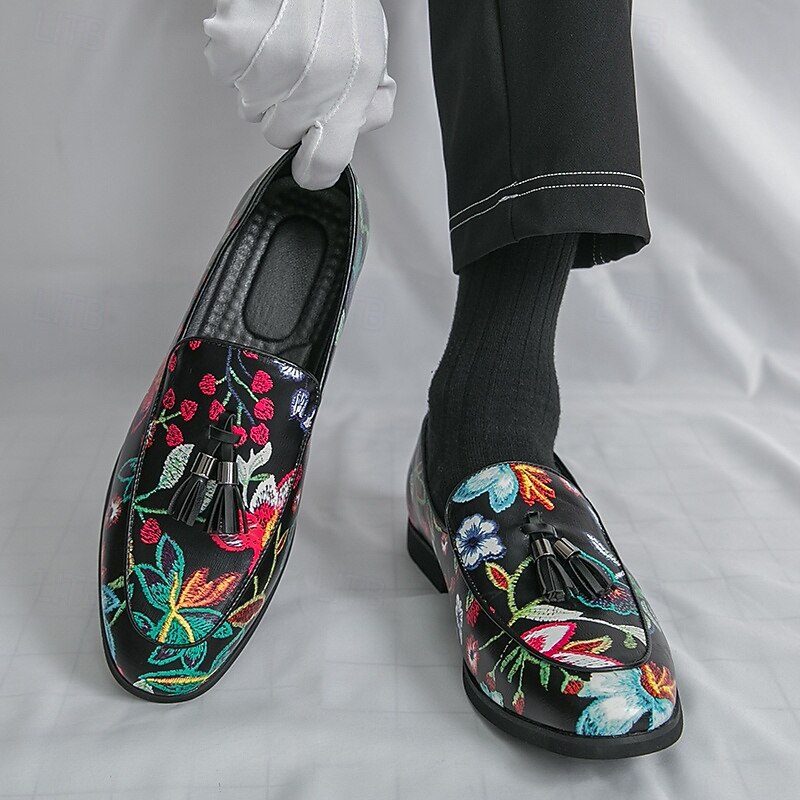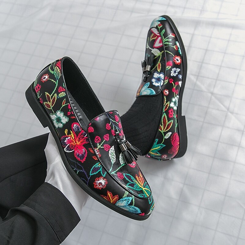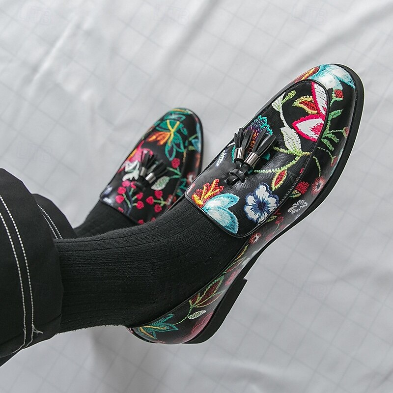 HOT ! Men's Black Floral Embroidered Tassel Loafers – Colorful Slip-On Dress Shoes for Weddings, Proms, Cocktail Parties and Performances