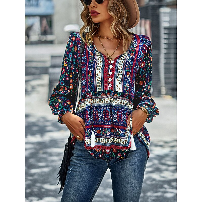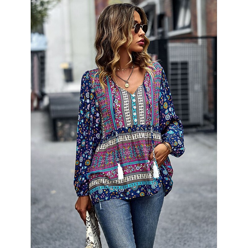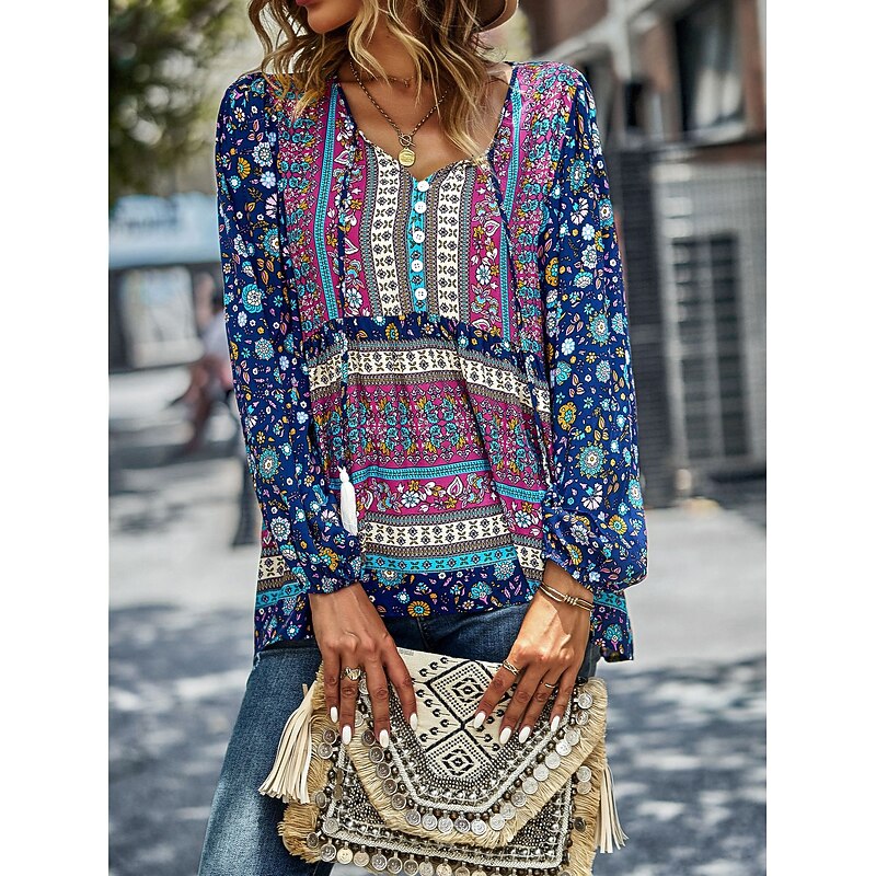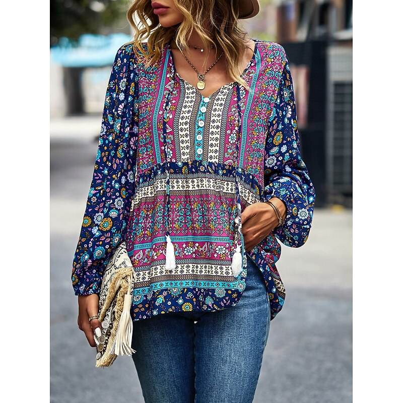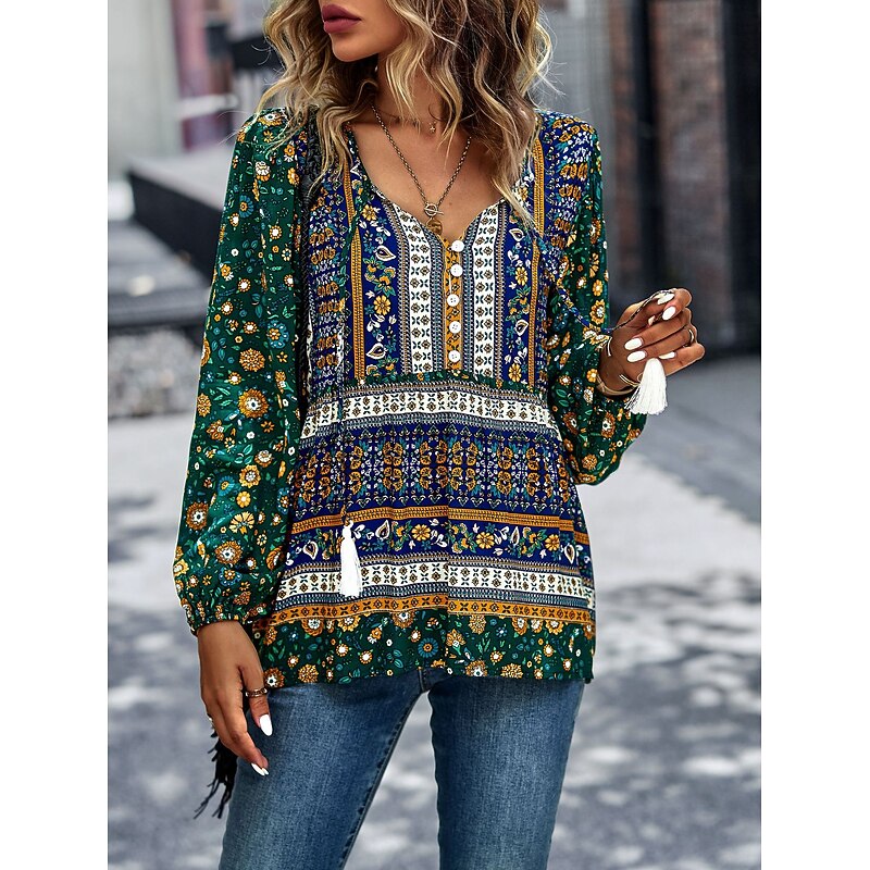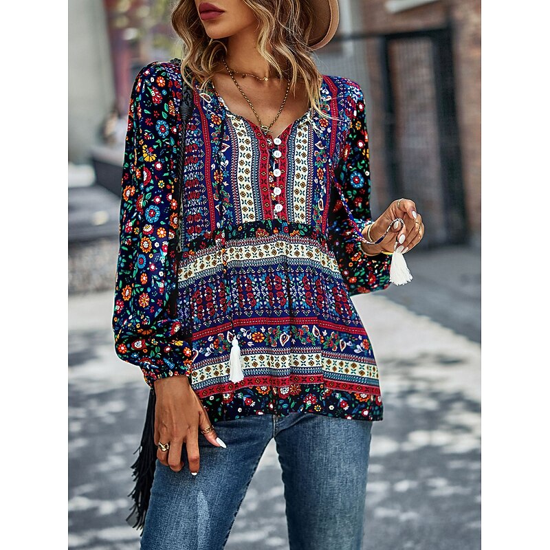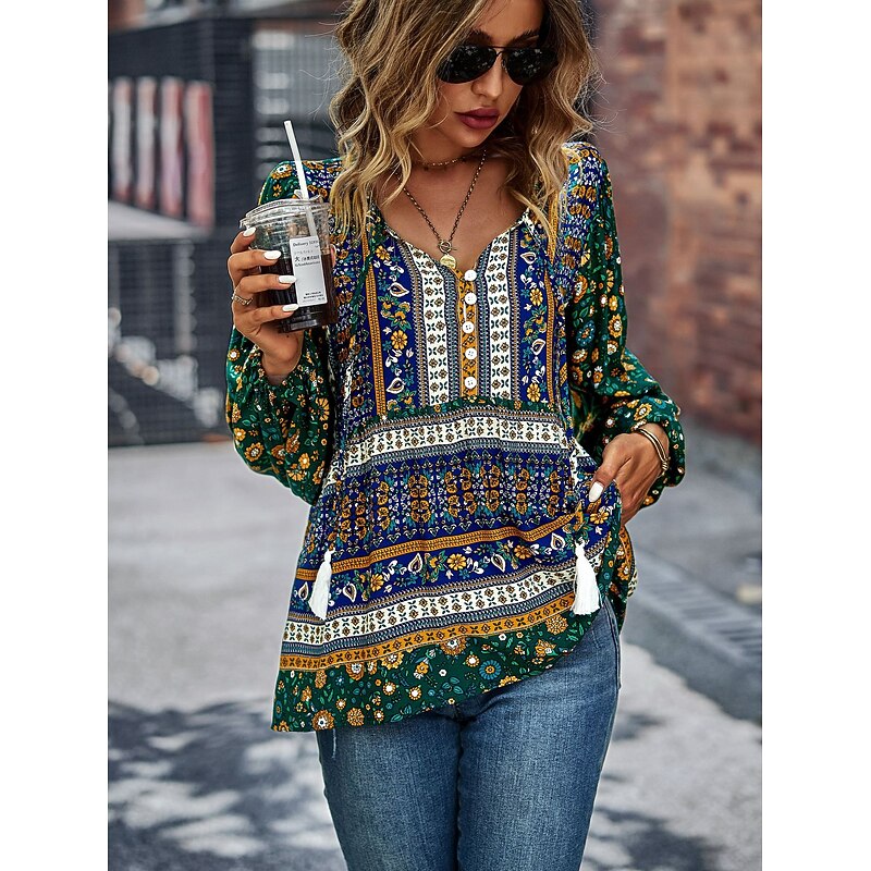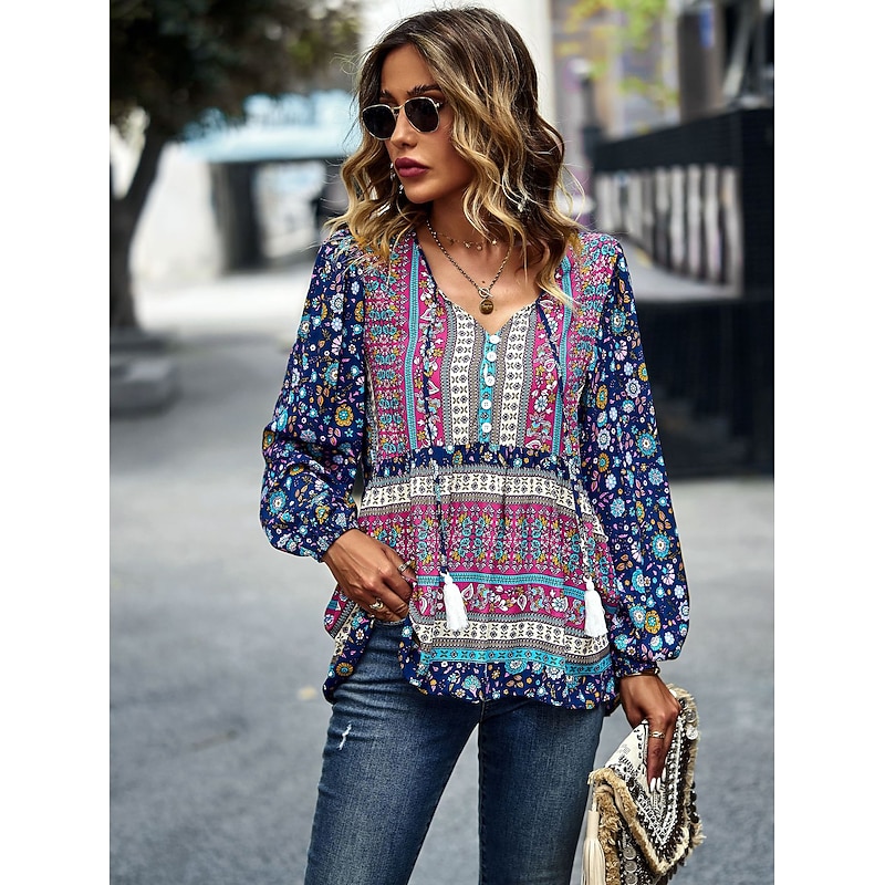 Highlights [Fabric and Pattern] : Crafted from lightweight polyester, this women's blouse features a vibrant floral print in a variety of rich colors, offering a micro-elastic fit that ensures comfort and ease of movement. The bohemian-inspired design is beautifully highlighted with intricate lace-up details along the neckline. [Fit and Design] : This blouse is tailored for a regular fit, which, combined with its long sleeves and flowy silhouette, offers a relaxed yet stylish look. The V-neck design adds a subtle touch of femininity, while the lace-up feature brings a boho-chic vibe to your ensemble. [Design Highlights] : The blouse is adorned with a unique lace-up front and tassel ties, elevating its bohemian charm. The vibrant floral pattern is complemented by vertical button details, adding elegance to its casual appeal. [Occasions] : Perfect for spring and fall, this blouse is a versatile choice for holiday outings, casual gatherings, or even daily wear. Its breathable fabric makes it ideal for both warm and cool weather, ensuring you stay comfortable while looking chic. [Size Range] : Available in sizes S to XL, this blouse accommodates a range of body types, making it a versatile addition to any wardrobe. Whether you prefer a snug or relaxed fit, this blouse adapts to your unique style preferences.