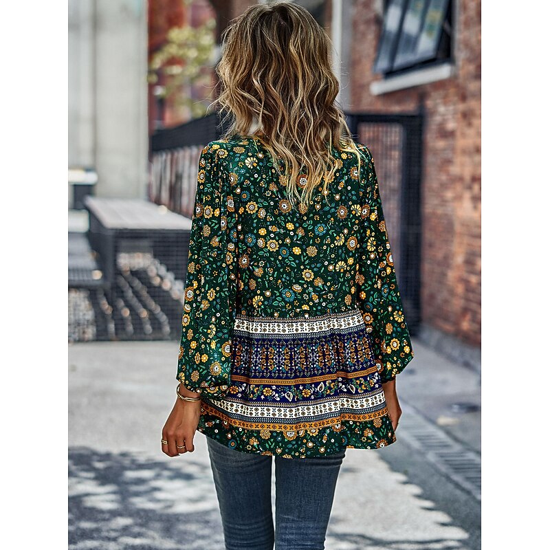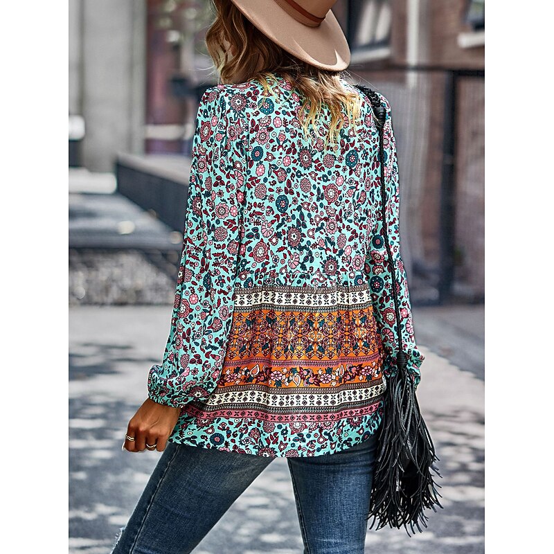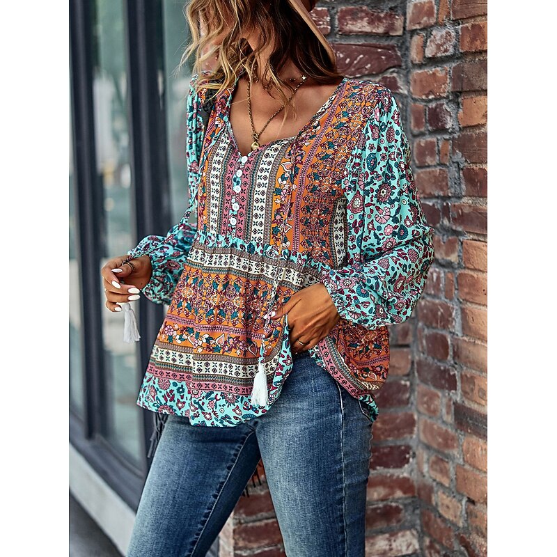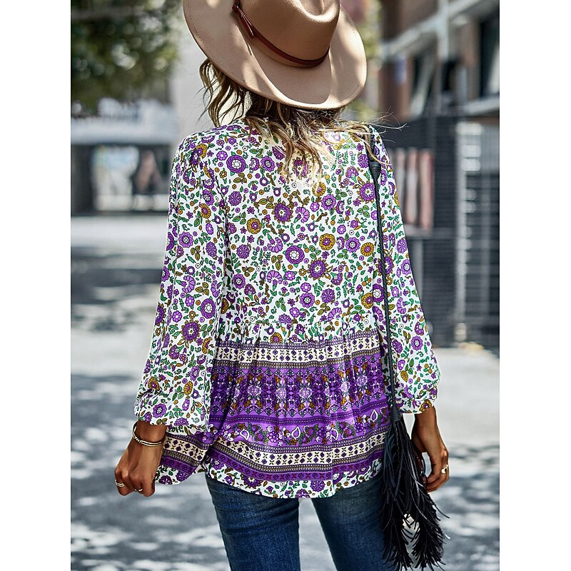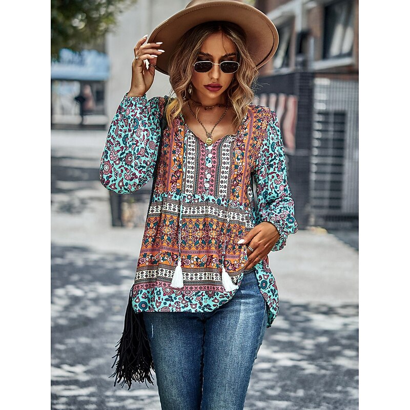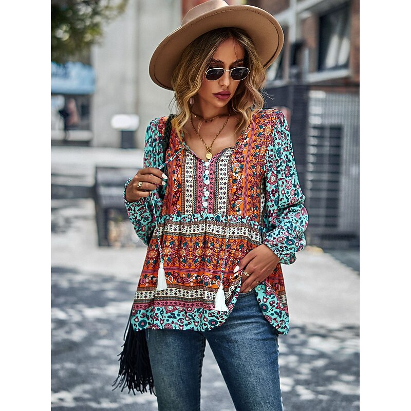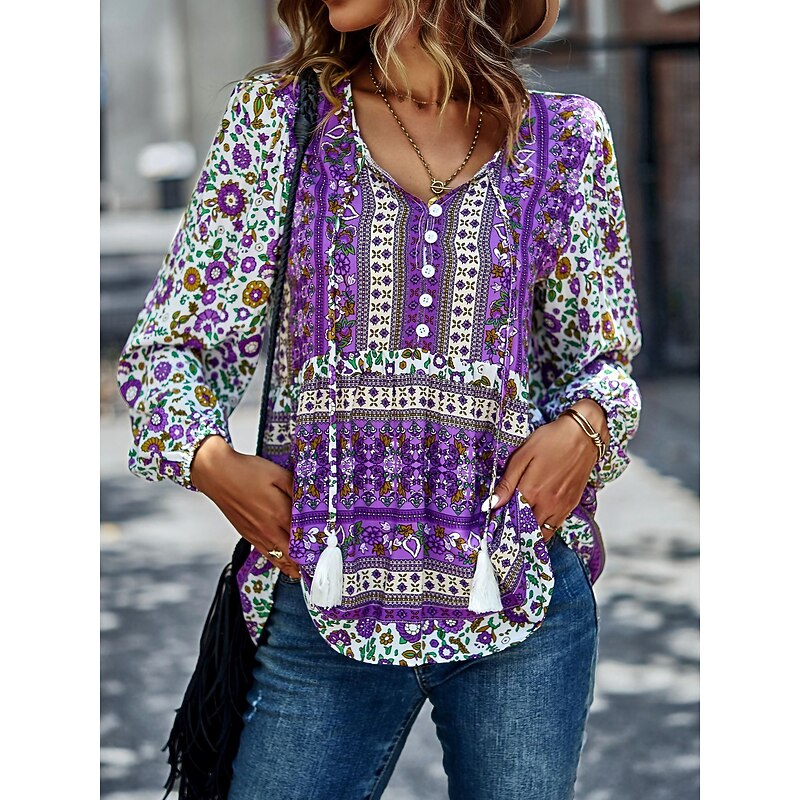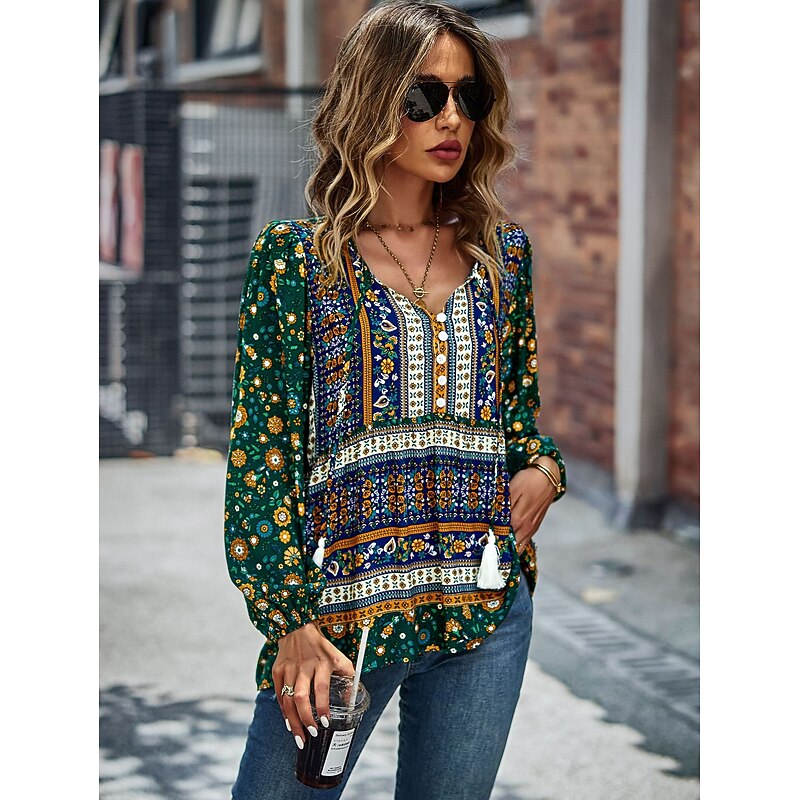 Highlights [Fabric and Pattern] : Crafted from lightweight polyester, this women's blouse features a vibrant floral print in a variety of rich colors, offering a micro-elastic fit that ensures comfort and ease of movement. The bohemian-inspired design is beautifully highlighted with intricate lace-up details along the neckline. [Fit and Design] : This blouse is tailored for a regular fit, which, combined with its long sleeves and flowy silhouette, offers a relaxed yet stylish look. The V-neck design adds a subtle touch of femininity, while the lace-up feature brings a boho-chic vibe to your ensemble. [Design Highlights] : The blouse is adorned with a unique lace-up front and tassel ties, elevating its bohemian charm. The vibrant floral pattern is complemented by vertical button details, adding elegance to its casual appeal. [Occasions] : Perfect for spring and fall, this blouse is a versatile choice for holiday outings, casual gatherings, or even daily wear. Its breathable fabric makes it ideal for both warm and cool weather, ensuring you stay comfortable while looking chic. [Size Range] : Available in sizes S to XL, this blouse accommodates a range of body types, making it a versatile addition to any wardrobe. Whether you prefer a snug or relaxed fit, this blouse adapts to your unique style preferences.