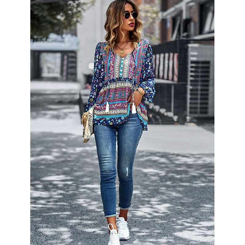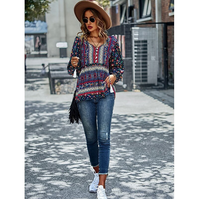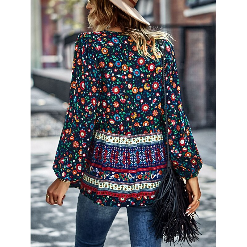 More information about Women's Shirt Boho Shirt Lace Shirt Blouse Fashion Floral Lace up Print Long Sleeve Regular Tops V Neck Casual Holiday Red Navy Blue Blue Purple Green Spring & Fall